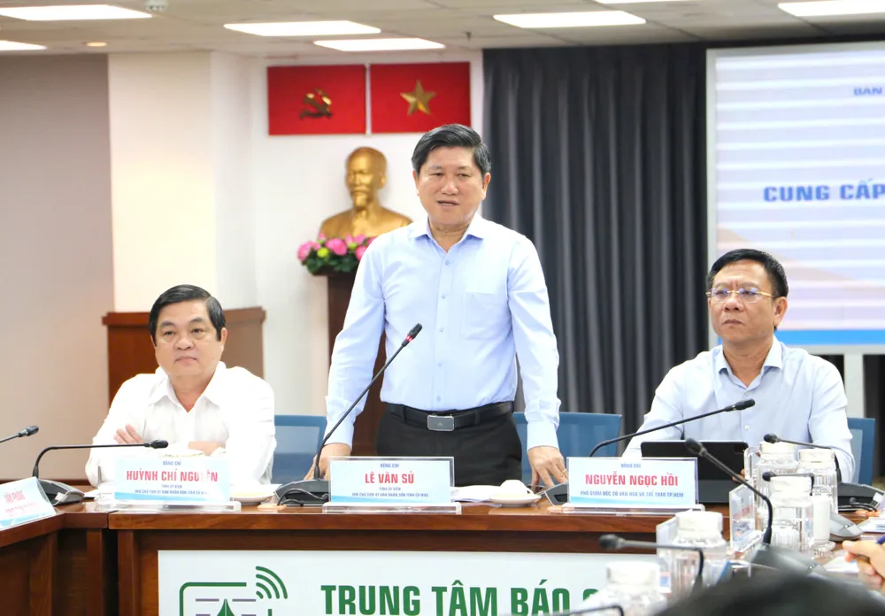 Lãnh đạo UBND tỉnh Cà Mau tại họp báo. Ảnh: HÀ THƯ