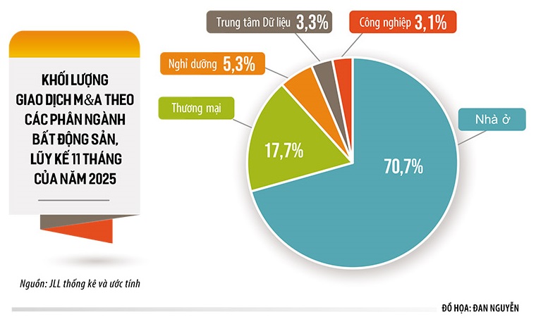 Theo quan sát của JLL đối với các thương vụ M&A có thông tin được công bố trong 11 tháng của năm 2025, tổng khối lượng giao dịch lũy kế đạt khoảng 2,4 tỷ USD.