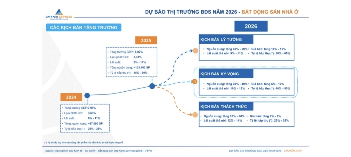 Về diễn biến thị trường trong năm 2026, bà Nguyễn Thị Kim Thoa, Giám đốc R&D Dat Xanh Services, đánh giá trong bối cảnh kinh tế vĩ mô được dự báo ổn định và chính sách điều hành theo hướng thận trọng, thị trường bất động sản nhà ở Việt Nam nhiều khả năng sẽ chuyển biến tích cực hơn, nhất là ở khía cạnh nguồn cung mới. Tuy nhiên, mức độ tăng trưởng và khả năng hấp thụ còn phụ thuộc vào nhiều biến số, qua đó, hình thành ba kịch bản phát triển gồm: kịch bản thách thức, kịch bản kỳ vọng và kịch bản lý tưởng.