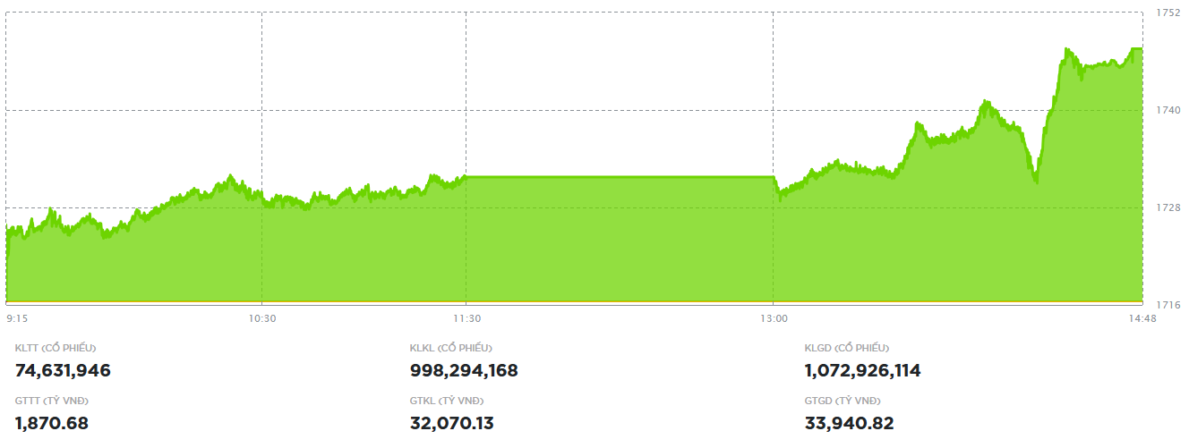 Đóng cửa, sàn HOSE có 177 mã tăng và 125 mã giảm, VN-Index tăng 31,08 điểm (+1,81%), lên 1.747,55 điểm. Tổng khối lượng giao dịch đạt hơn 1,07 tỷ đơn vị, giá trị 33.940,8 tỷ đồng, giảm nhẹ 3% về khối lượng nhưng tăng nhẹ gần 2% về giá trị so với phiên hôm qua. Giao dịch thỏa thuận đóng góp hơn 48,7 triệu đơn vị, giá trị 2.103 tỷ đồng.