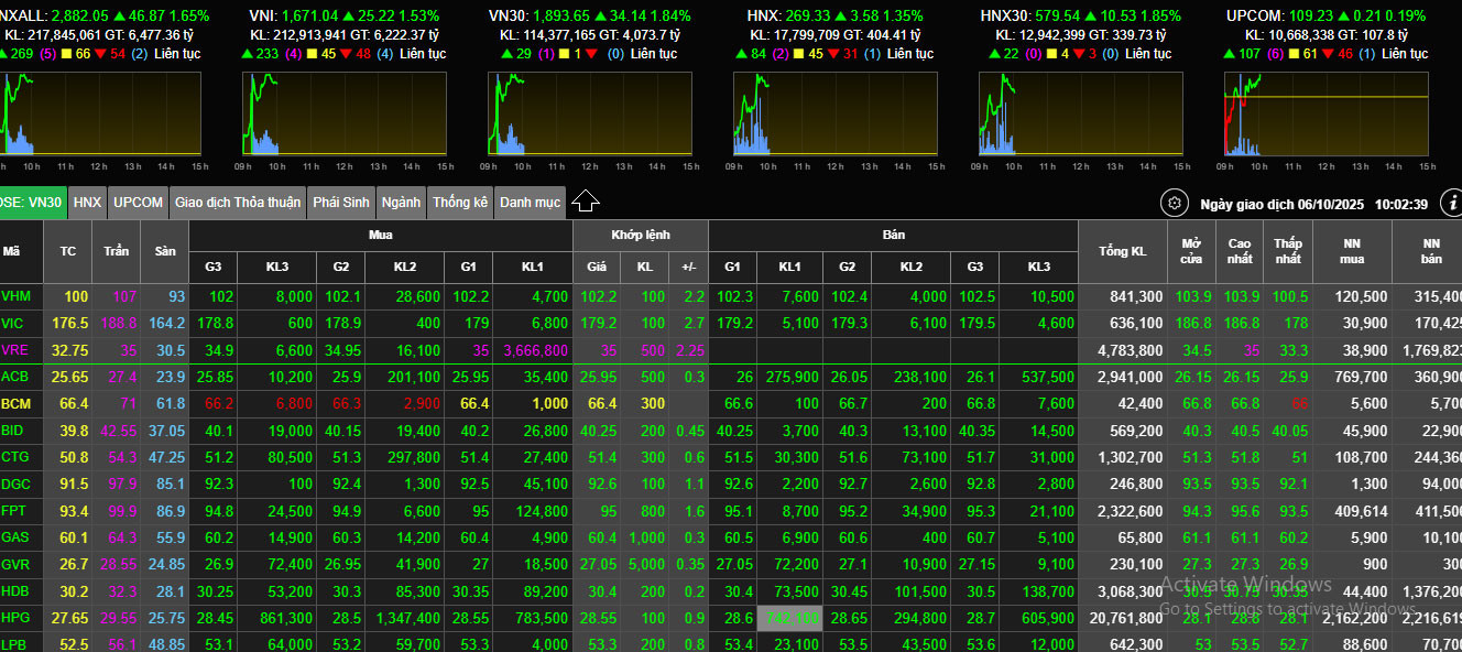 Mở cửa phiên giao dịch 6/10, 30 cổ phiếu trụ cột nhóm VN30 đồng loạt tăng điểm, khiến thị trường trở nên sôi động. Trước đó, thị trường đã ghi nhận một tuần trầm lắng, giá xuống và thanh khoản yếu, từ mức 50.000-75.000 tỷ đồng xuống còn 20.000-25.000 tỷ đồng/phiên.