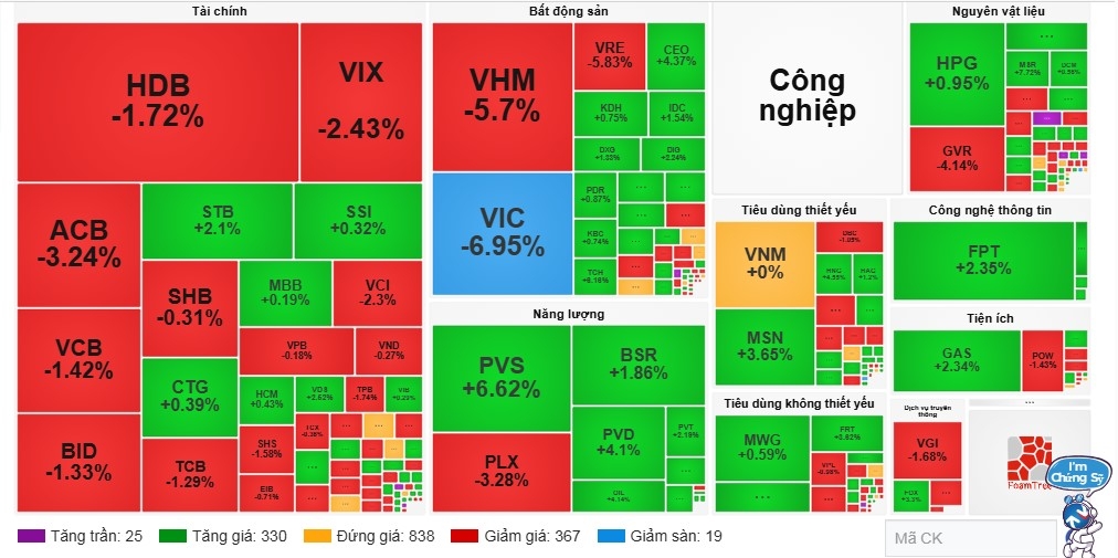 Thị trường giảm điểm mạnh, song, độ mở nhóm ngành vẫn nghiêng về sắc xanh khi có tới 13/21 nhóm ngành đóng cửa tăng điểm. Công nghệ viễn thông (2,40%), Thủy sản (2,05%) và Dầu khí (1,48%) là ba nhóm ngành tăng điểm mạnh nhất. Ở chiều ngược lại, Bất động sản (-5%), Bất động sản Khu công nghiệp (-2,26%) và Điện (-0,89%) là ba nhóm ngành chịu áp lực điều chỉnh mạnh nhất trong phiên hôm nay.