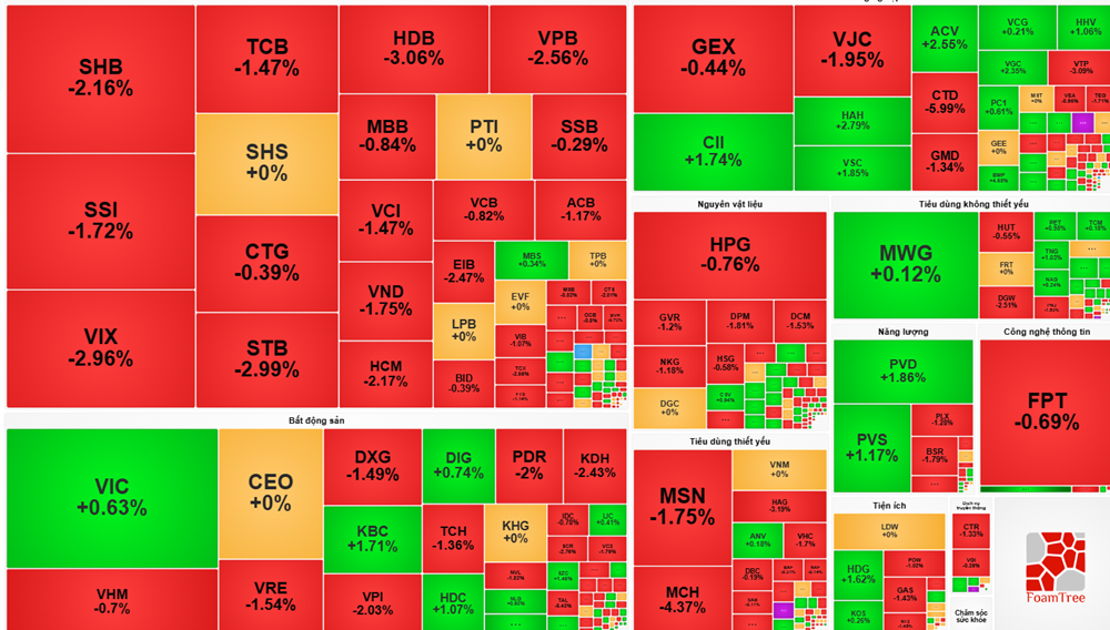 Ở chiều giảm điểm: VPB, VCB và HDB là ba cái tên tác động tiêu cực nhất lên VN-Index.