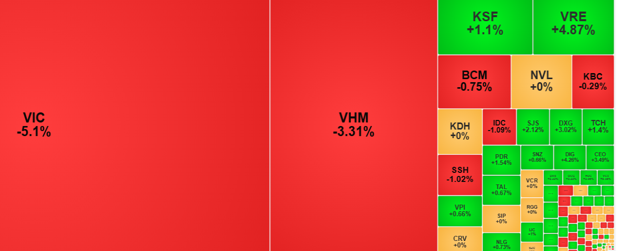 Thị trường giảm điểm dù cổ phiếu tăng giá chiếm ưu thế do ảnh hưởng từ nhóm cổ phiếu trụ cột. Điển hình là nhóm cổ phiếu họ Vingroup khi VIC và VHM lần lượt lấy đi 18,2 điểm và 4,28 điểm. Hai mã này đã diễn biến tích cực thời gian qua.