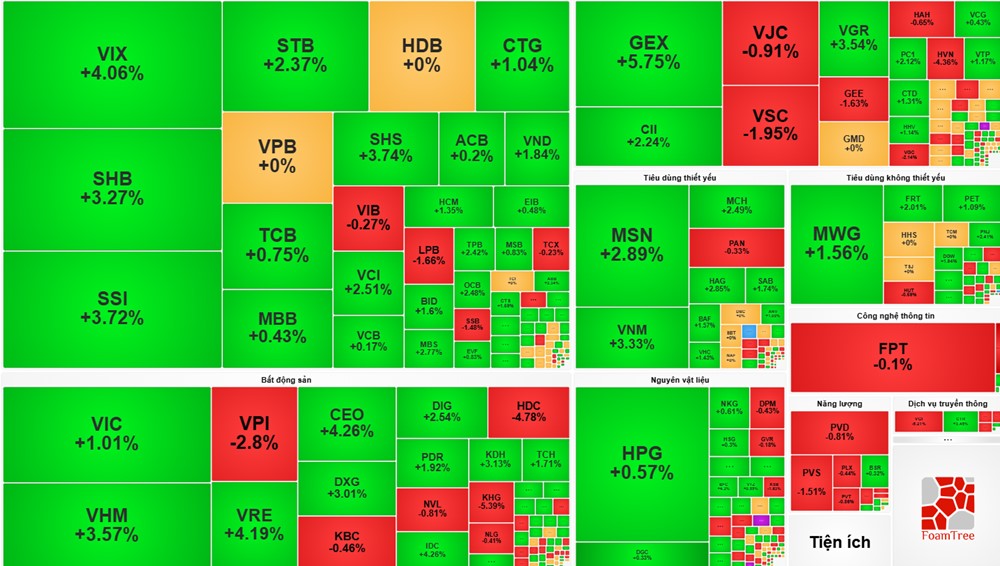 Nhóm tài chính - ngân hàng tiếp tục là trụ đỡ quan trọng, với loạt cổ phiếu tăng giá mạnh. VIX (+4,06%), SSI (+3,72%), SHB (+3,27%) và STB (+2,37%) đều ghi nhận mức tăng ấn tượng, đóng góp đáng kể vào mức tăng chung của chỉ số.