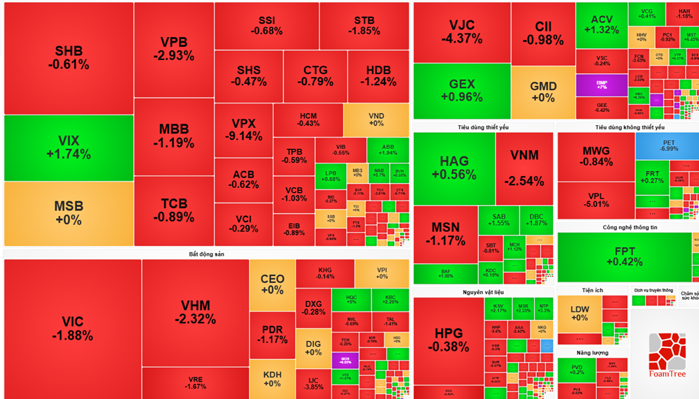 Ở nhóm bất động sản, sắc đỏ bao trùm với mức giảm sâu tại các mã vốn hóa lớn. VIC giảm 1,88%, VHM giảm 2,32%, VRE giảm 1,67%, tiếp tục gây sức ép mạnh lên chỉ số. Một số mã giữ được mức giá tham chiếu như CEO, song thanh khoản yếu cho thấy lực cầu vẫn dè dặt.