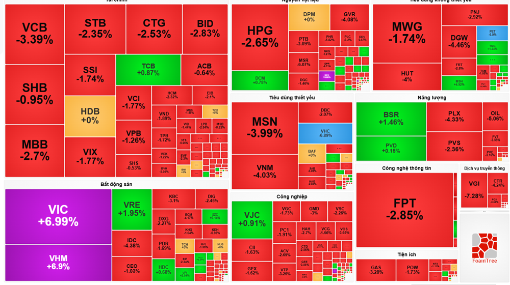 Ở nhóm nguyên vật liệu và công nghiệp, HPG tiếp tục chịu áp lực khi giảm 2,65%, trong khi nhiều cổ phiếu thép và vật liệu xây dựng khác cũng giao dịch kém tích cực. Công nghệ thông tin ghi nhận phiên giảm mạnh của FPT với mức mất gần 3%, trở thành một trong những cổ phiếu tác động tiêu cực đáng kể lên chỉ số.
