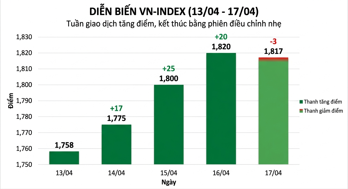 Kết tuần, VN-Index đóng cửa tại 1.817,17 điểm, tăng hơn 67 điểm, tương đương 3,84% so với tuần trước và tăng 4,5% so với đầu tuần, đánh dấu tuần hồi phục thứ tư liên tiếp. Mặc dù vậy, thanh khoản tuần qua vẫn chưa bùng nổ như kỳ vọng khi chỉ đạt hơn 125.000 tỷ đồng.