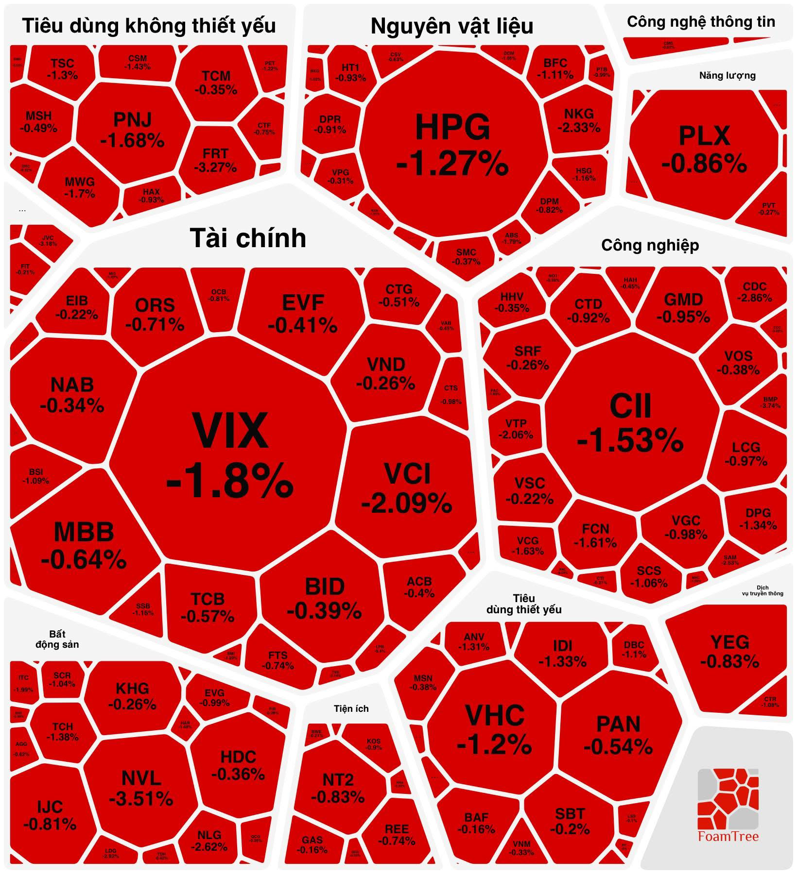 Ngoài ra, nhóm cổ phiếu công nghiệp, thép, tiêu dùng cũng chìm trong sắc đỏ: CII giảm 1,53%, BMP giảm 3,74%, VTP giảm 2,06%; HPG giảm 1,27%, NKG giảm 2,33%, HSG giảm 1,16%; DBC giảm 1,1%, VHC giảm 1,2%, MWG giảm 1,7%, FRT giảm 2,27%, PNJ giảm 1,68%...