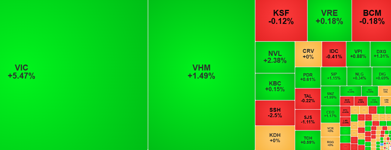 Đáng chú ý, tại nhóm bất động sản, phần lớn số mã tăng giá; đặc biệt, các mã thuộc Vingroup đều hiện sắc xanh. Trong đó, VIC – mã lớn nhất thị trường – tăng 5,47%, đóng góp nhiều nhất vào VN-Index với 12,77 điểm; tiếp đến là VHM (1,6 điểm).