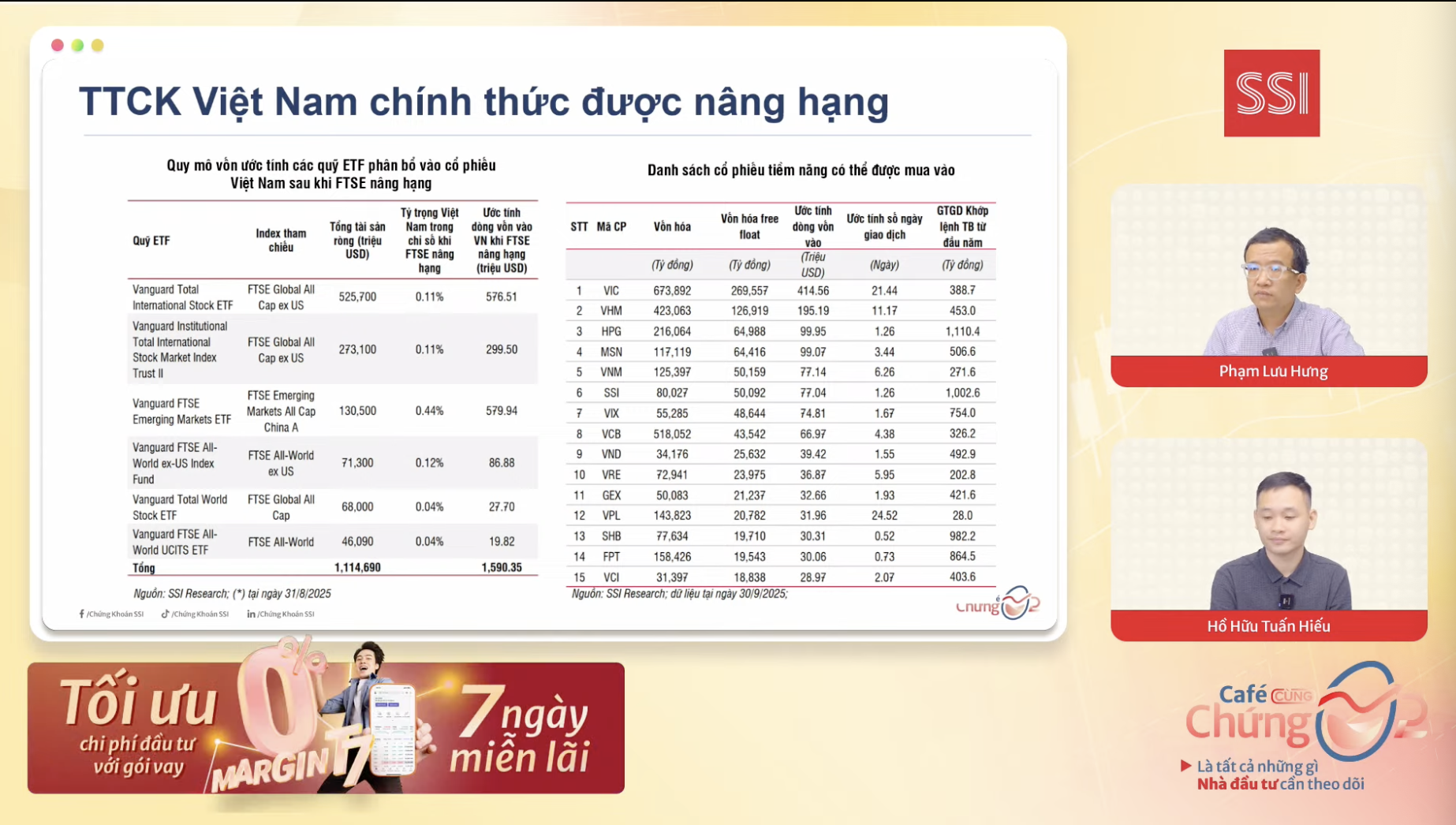 Ông Hưng cho biết, thị trường này là thị trường của kỳ vọng nên vào thời điểm chính thức được mua vào thì giá cổ phiếu đã phản ánh hết. Nên SSI Research đưa ra danh mục cổ phiếu có khả năng hưởng lợi từ vốn ngoại khi mà Việt Nam chính thức nâng hạng, câu chuyện còn 1 năm nữa nên khi SSI đưa cổ phiếu thì sẽ xem xét thêm yếu tố cơ bản.