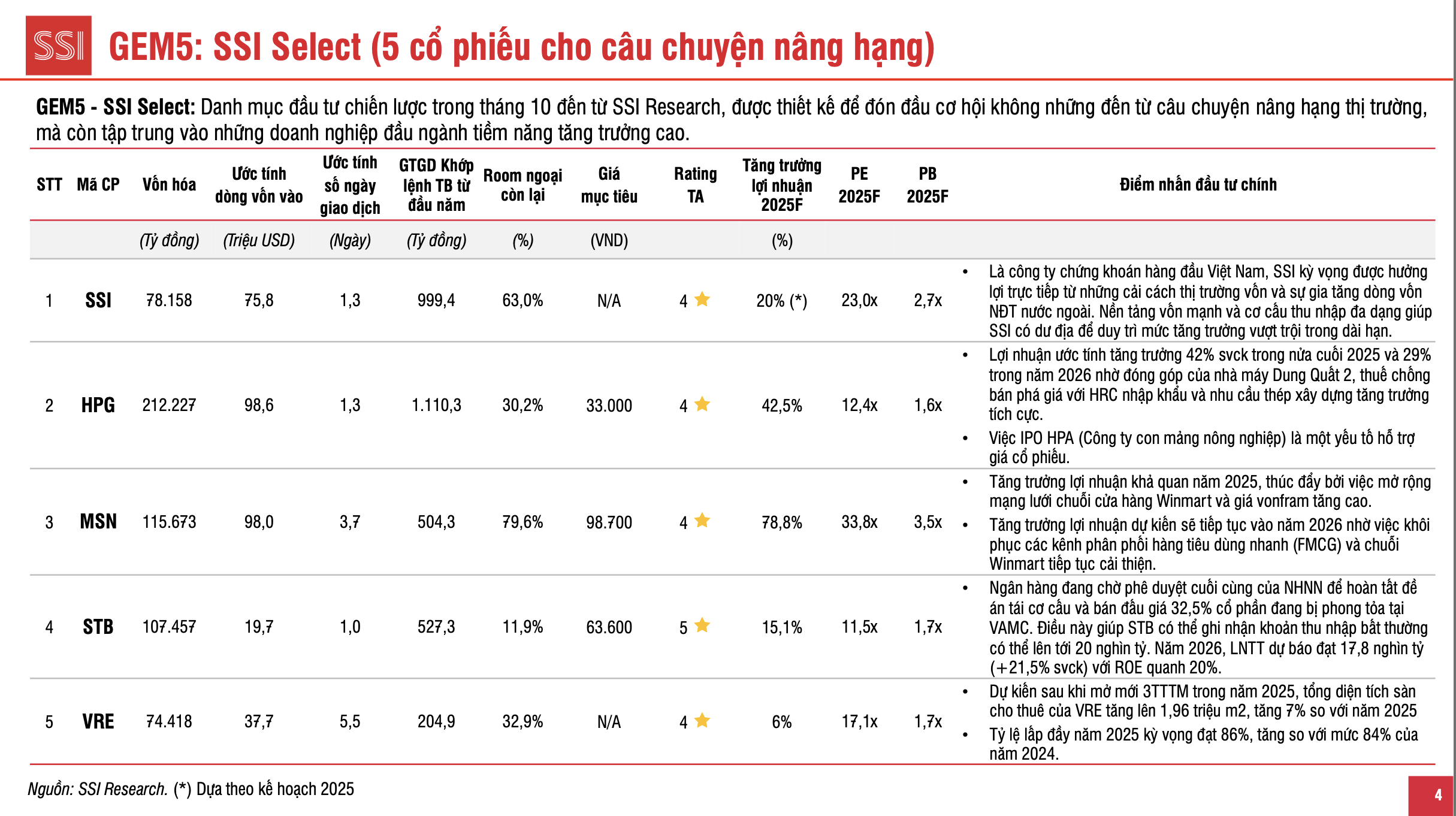 Mới đây, SSI Research có khuyến nghị 5 cổ phiếu trong Danh mục đầu tư chiến lược trong tháng 10, được thiết kế để đón đầu cơ hội không những đến từ câu chuyện nâng hạng thị trường, mà còn tập trung vào những doanh nghiệp đầu ngành tiềm năng tăng trưởng cao.