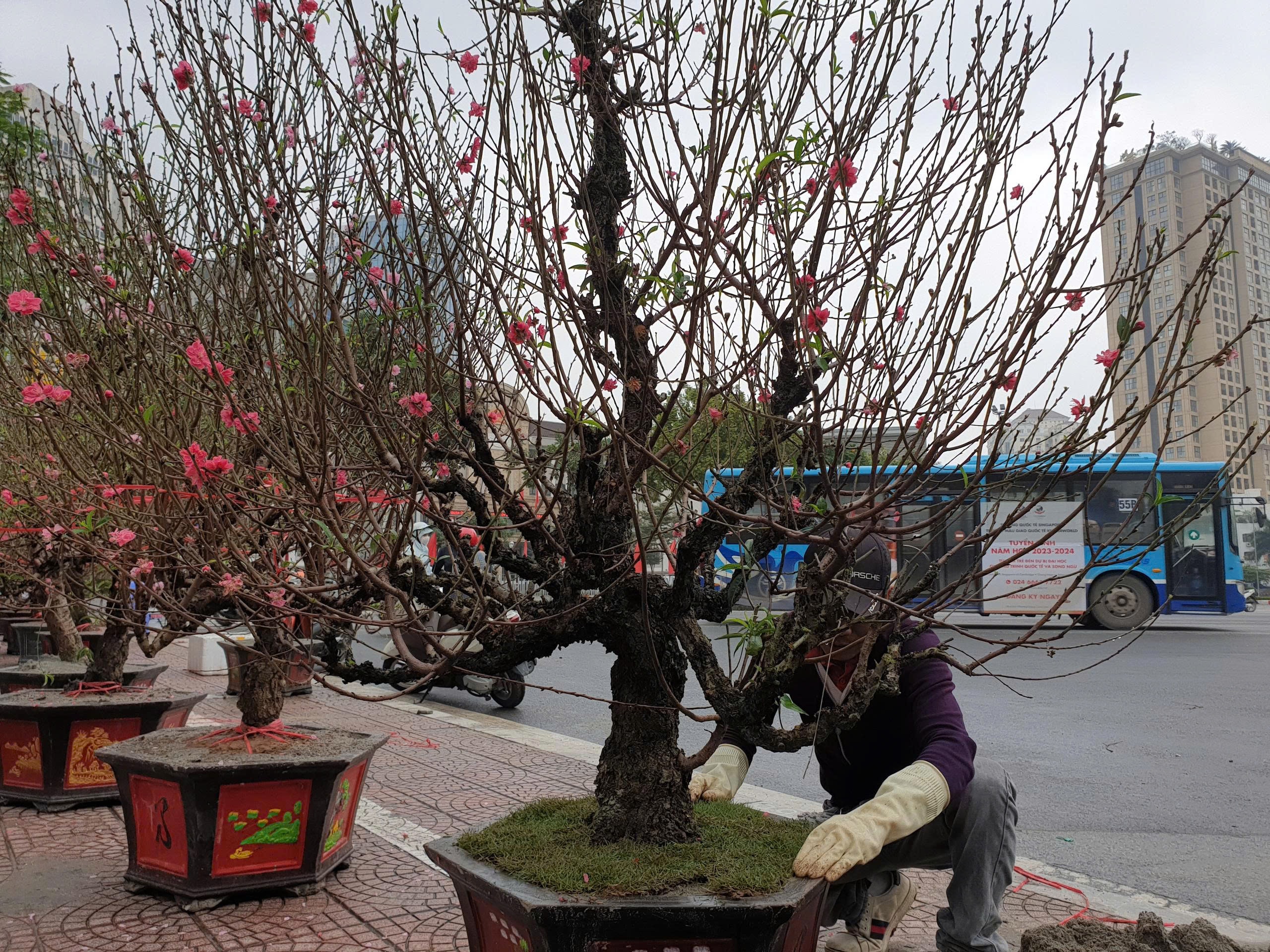 Tiểu thương chăm sóc cây đào. Ảnh: Thanh Bình