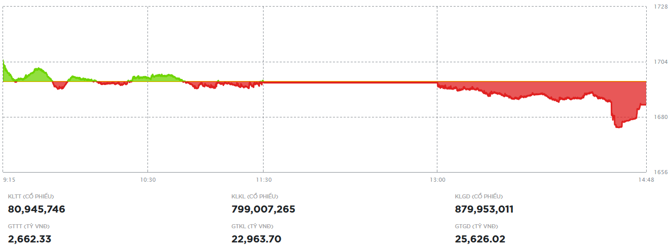 Đóng cửa, sàn HOSE có 77 mã tăng và 247 mã giảm, VN-Index giảm 10,20 điểm (-0,60%), xuống 1.685,3 điểm. Tổng khối lượng giao dịch đạt gần 880 triệu đơn vị, giá trị 25.626 tỷ đồng, giảm hơn 18% về khối lượng và 19% về giá trị so với phiên hôm qua. Giao dịch thỏa thuận đóng góp hơn 68 triệu đơn vị, giá trị 2.140 tỷ đồng.