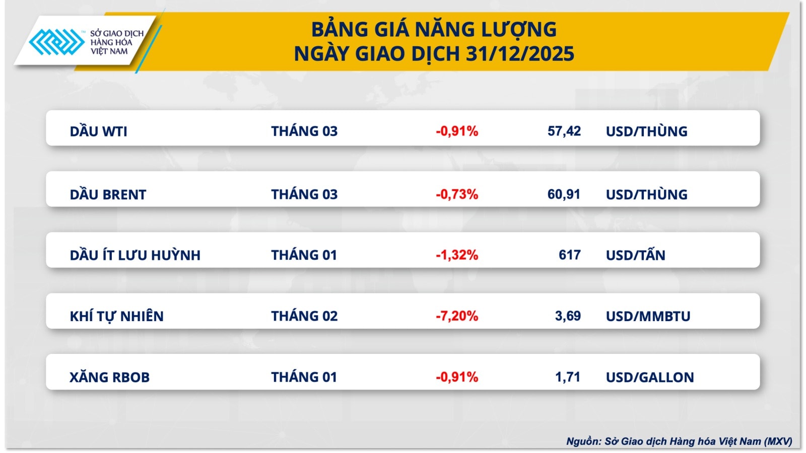 Trên thị trường năng lượng, giá dầu thô đồng loạt giảm trong phiên giao dịch cuối năm. Dầu WTI giảm 0,4%, xuống 57,74 USD/thùng, trong khi dầu Brent mất 0,35%, còn 61,12 USD/thùng. Tính chung cả năm 2025, giá dầu Brent giảm hơn 18%, còn dầu WTI giảm gần 20%.