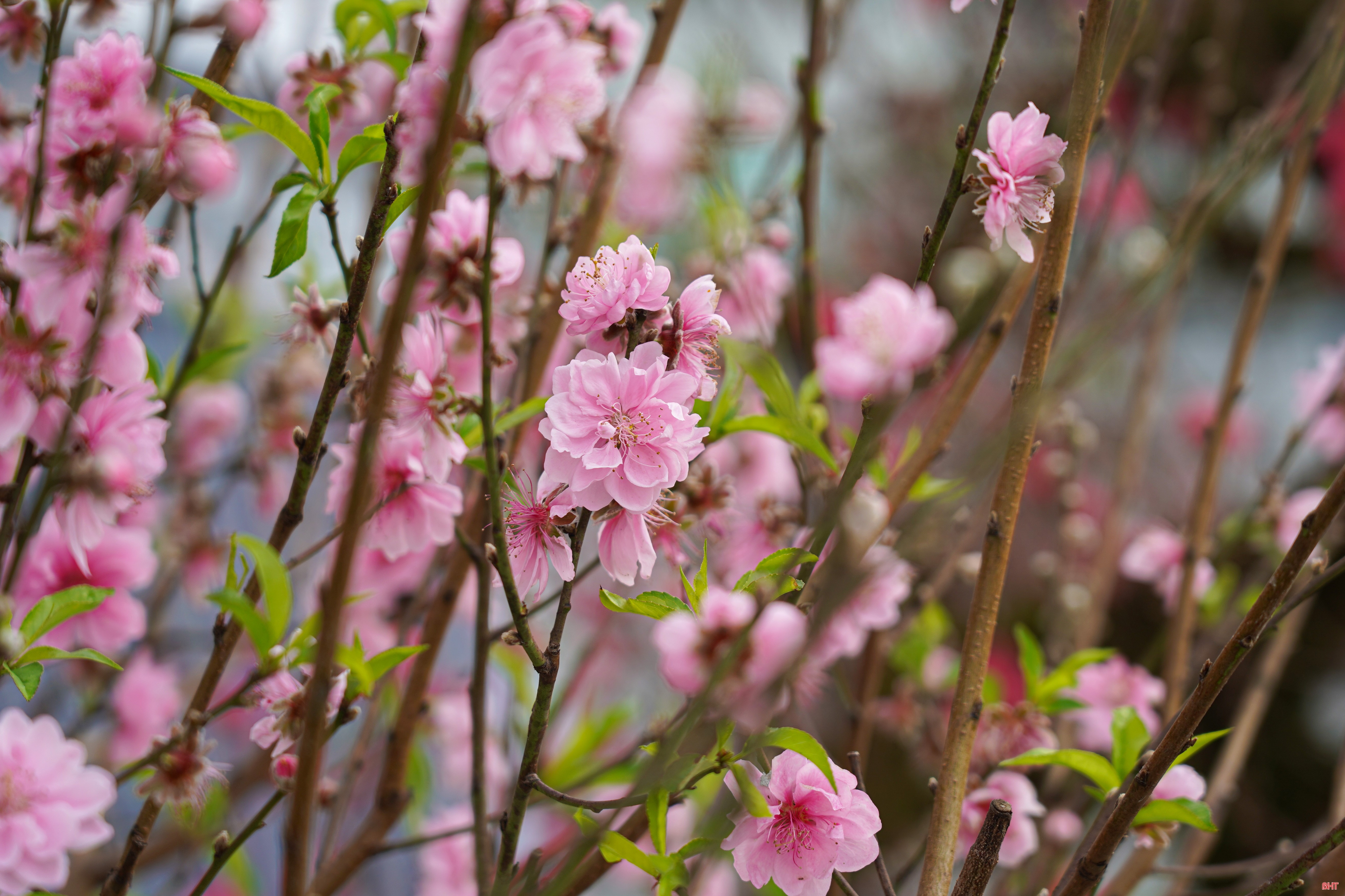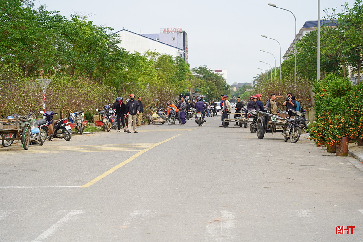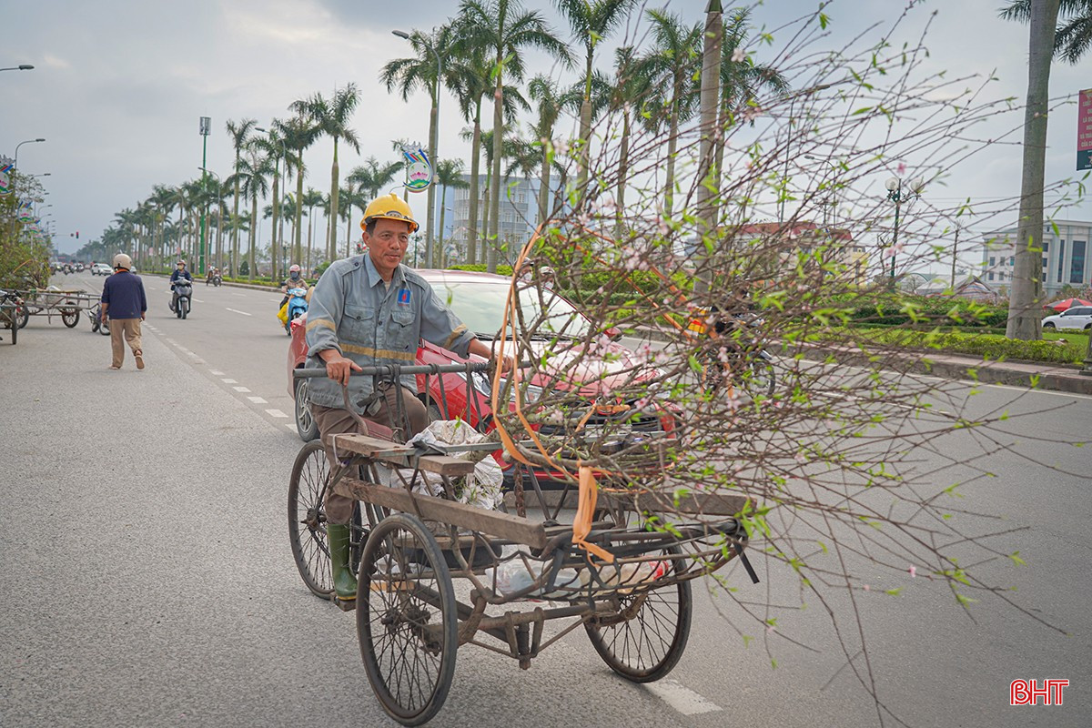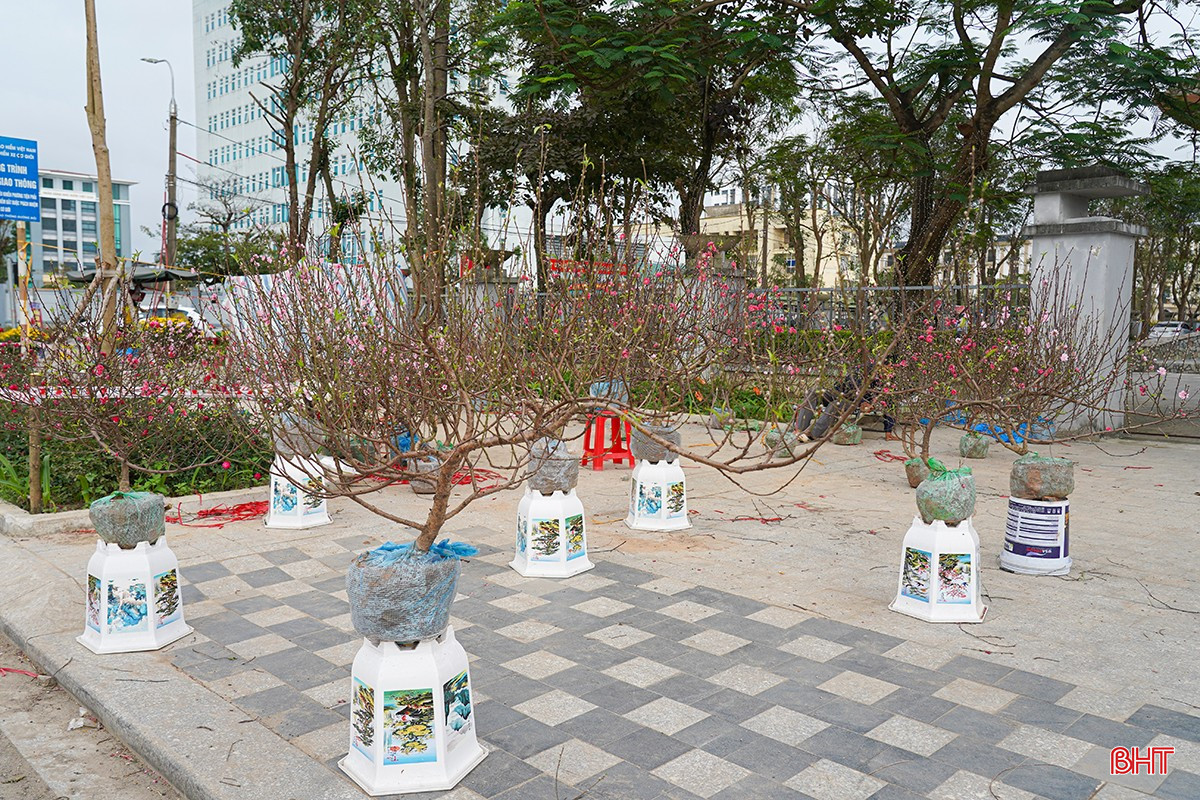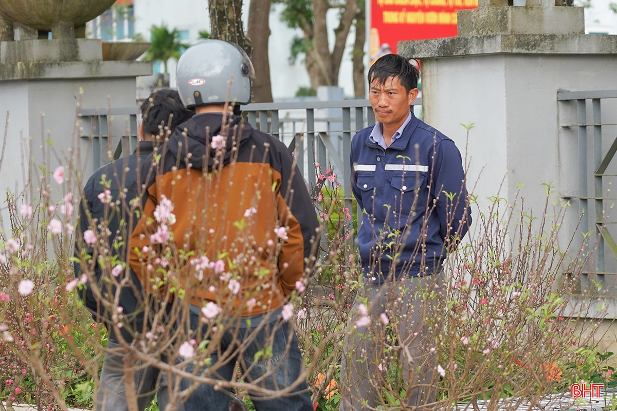Tại gian hàng đào của anh Trần Văn Kiên (chủ vườn đào Ninh Bình) trên đường Xô Viết Nghệ Tĩnh, gần 200 cây đào các loại được đưa vào thị trường Hà Tĩnh từ đầu vụ. Đến nay chỉ còn hơn 50 cây, chủ yếu là dòng bình dân, giá từ 550 nghìn đến khoảng 1,2 triệu đồng/cây.