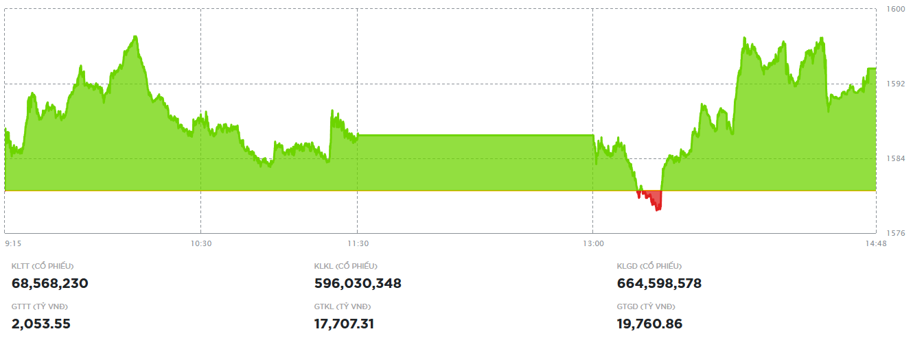 Đóng cửa, sàn HOSE có 186 mã tăng và 114 mã giảm, VN-Index tăng 13,07 điểm (+0,83%), lên 1.593,61 điểm. Tổng khối lượng giao dịch đạt hơn 644,5 triệu đơn vị, giá trị 19.760,9 tỷ đồng, giảm hơn 12% về khối lượng 7% về giá trị so với phiên hôm qua. Giao dịch thỏa thuận đóng góp hơn 68,5 triệu đơn vị, giá trị 2.053 tỷ đồng.