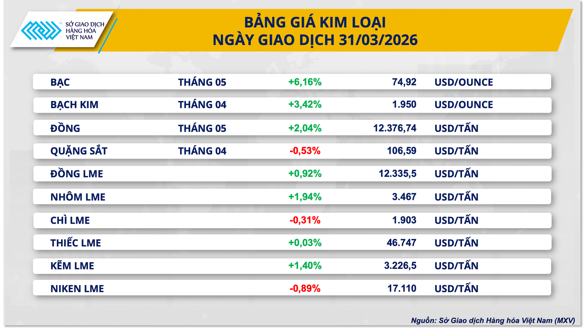 Theo Sở Giao dịch Hàng hóa Việt Nam (MXV), nhóm kim loại quý là điểm sáng nổi bật khi toàn bộ các mặt hàng đồng loạt tăng giá, dẫn dắt bởi bạc. Giá bạc COMEX kéo dài chuỗi tăng sang phiên thứ ba liên tiếp, bật tăng hơn 6% lên sát mốc 75 USD/ounce, mức cao nhất trong gần hai tuần.