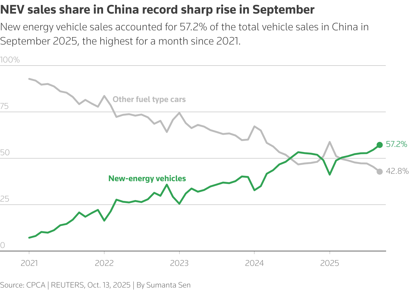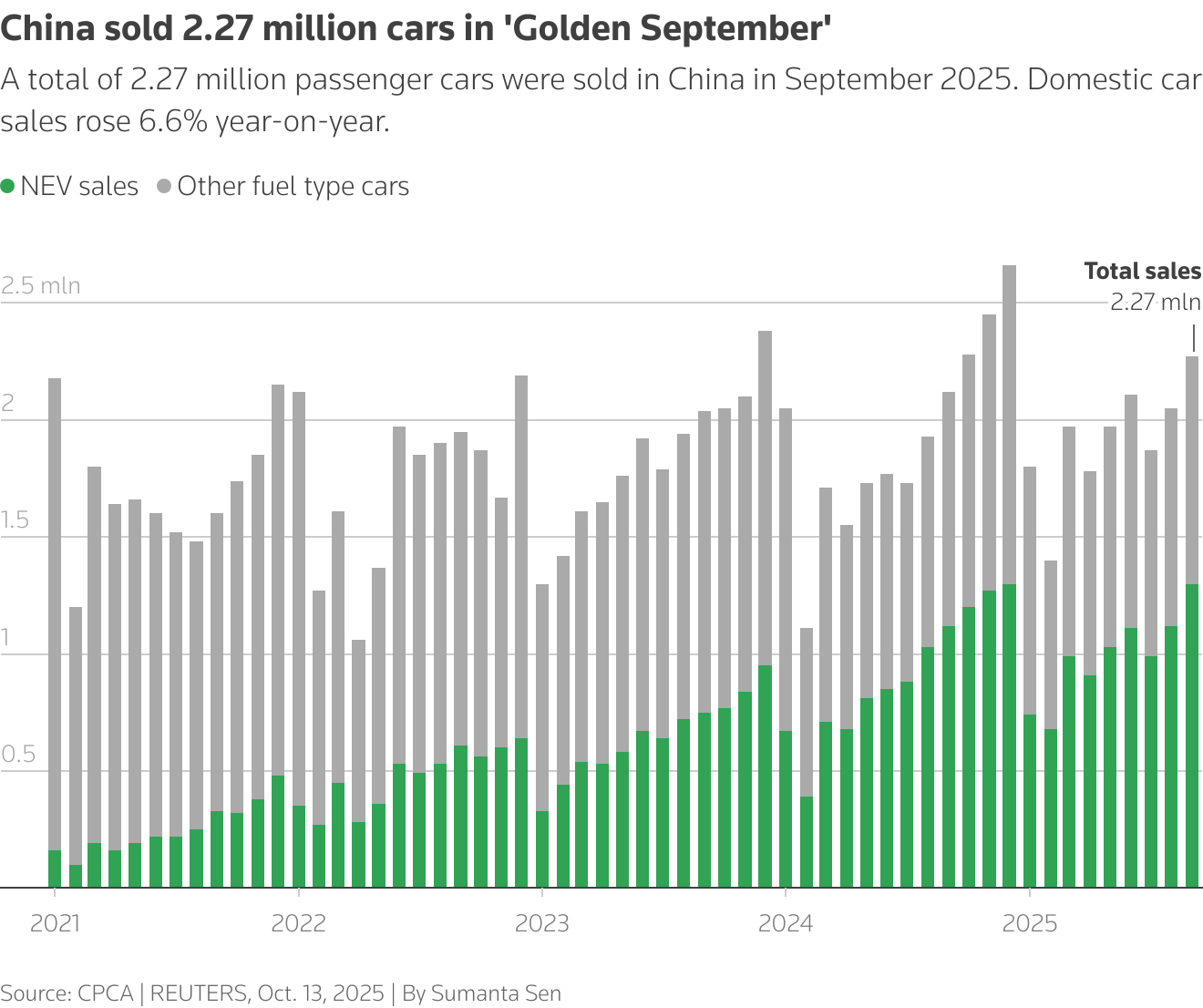 Theo Hiệp hội Xe du lịch Trung Quốc (CPCA), doanh số ôtô trong nước đạt 2,27 triệu chiếc trong tháng 9/2025, tăng 6,6% so với cùng kỳ năm ngoái.