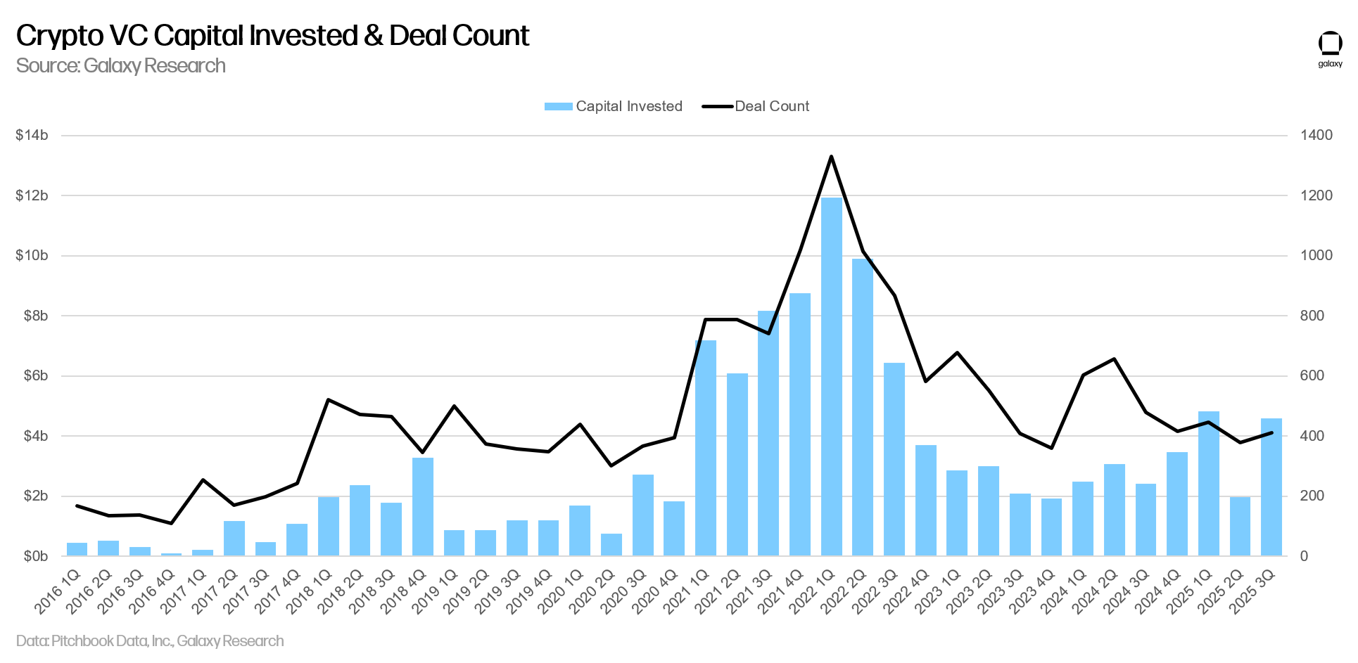 Dòng vốn đầu tư mạo hiểm tập trung vào các công ty blockchain khởi nghiệp trong quý III/2025 đạt mức cao thứ hai kể từ khi sàn giao dịch FTX sụp đổ vào cuối năm 2022. Nguồn Glaxy Research.