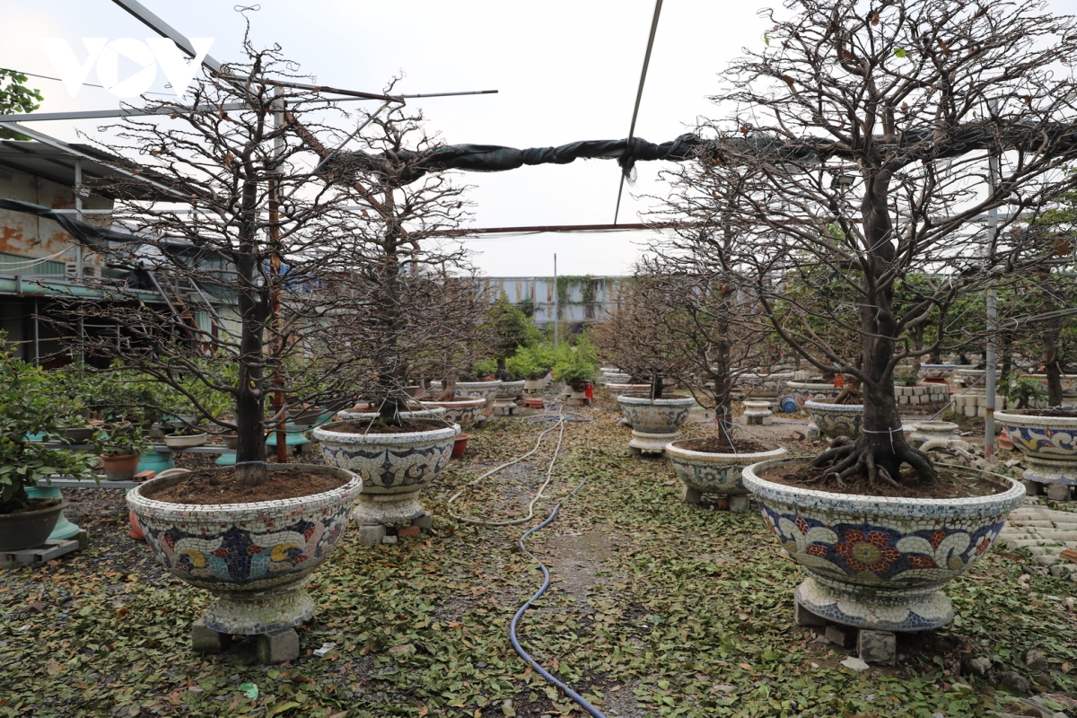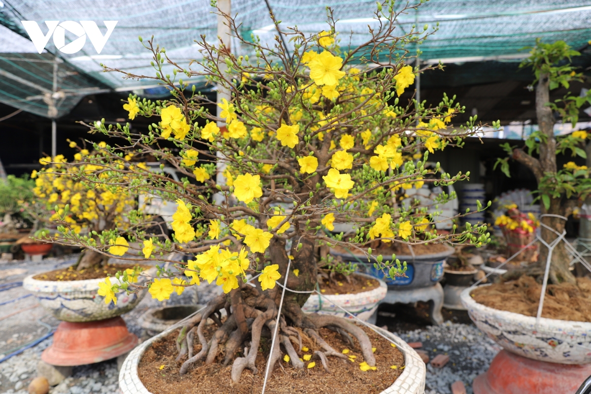 Có những chậu mai lớn được nhiều khách hàng đặt sớm để chở ra Hà Nội (Ảnh: Hoàng Minh).