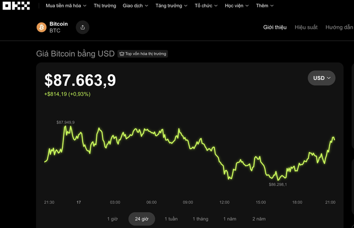 Tối 17-12, thị trường tiền số diễn biến trái chiều. Dữ liệu từ sàn OKX cho thấy trong 24 giờ qua, Bitcoin tăng nhẹ gần 1%, lên quanh 87.600 USD.
