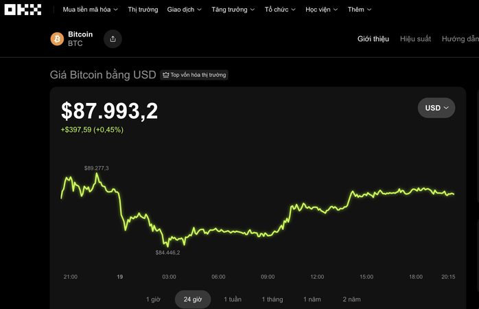 Tối 19-12, thị trường tiền số ghi nhận diễn biến tích cực nhưng mức tăng còn thận trọng. Dữ liệu từ sàn OKX cho thấy trong 24 giờ qua, Bitcoin nhích lên 0,4%, giao dịch quanh 87.990 USD.