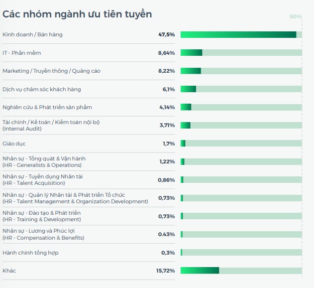 Mặc dù trọng tâm tuyển dụng dồn về công nghệ, các nhóm ngành kinh doanh cốt lõi vẫn duy trì sức nóng vốn có. Kinh doanh và Bán hàng vẫn là nhóm nghề được săn đón nhiều nhất với 47,5% doanh nghiệp có nhu cầu, tiếp theo là IT - Phần mềm và Marketing - Truyền thông. Tuy nhiên, yêu cầu đối với các vị trí này cũng đang thay đổi theo hướng đòi hỏi ứng viên phải biết ứng dụng công nghệ để gia tăng hiệu quả công việc, giảm thiểu các tác vụ thủ công lặp lại.