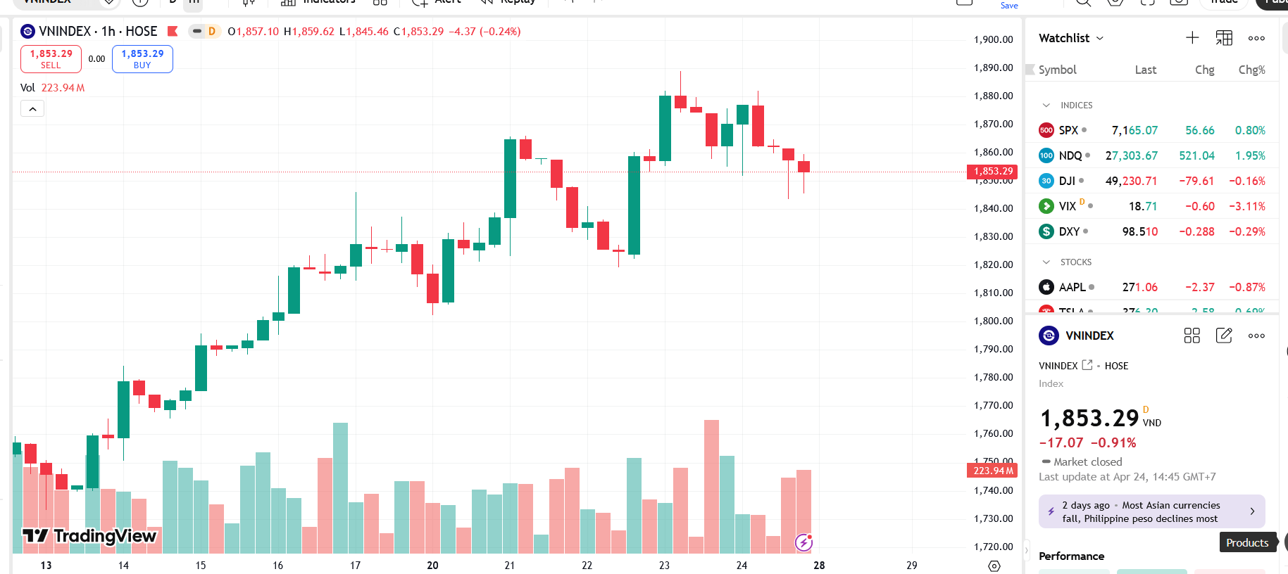 “VN-Index dao động trong biên độ 1845–1890 điểm như dự báo. Thanh khoản giảm mạnh cho thấy áp lực bán tiết chế và chỉ số vẫn đang trong quá trình điều tiết cung ngắn hạn. Theo đó, trong phiên 28/04, VN-Index nhiều khả năng sẽ tiếp tục vận động trong vùng biên độ này”.