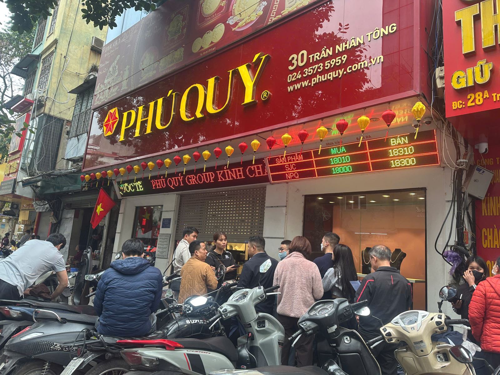 Từ sáng sớm 17/3, nhiều người dân đã xếp hàng trước cửa hàng vàng tại phố Trần Nhân Tông, Hà Nội. Ảnh: Minh Phương/Báo Tin tức và Dân tộc