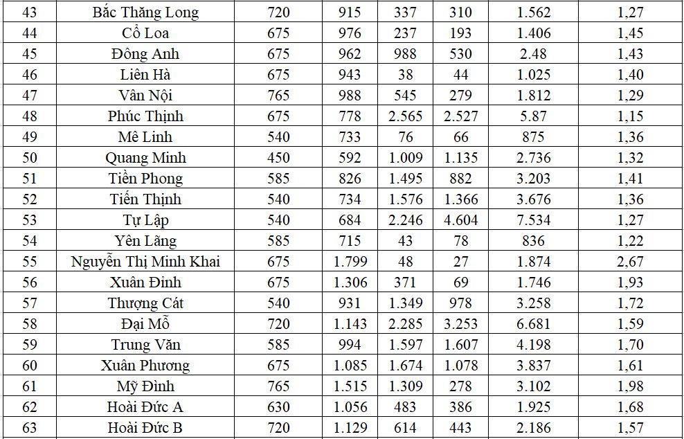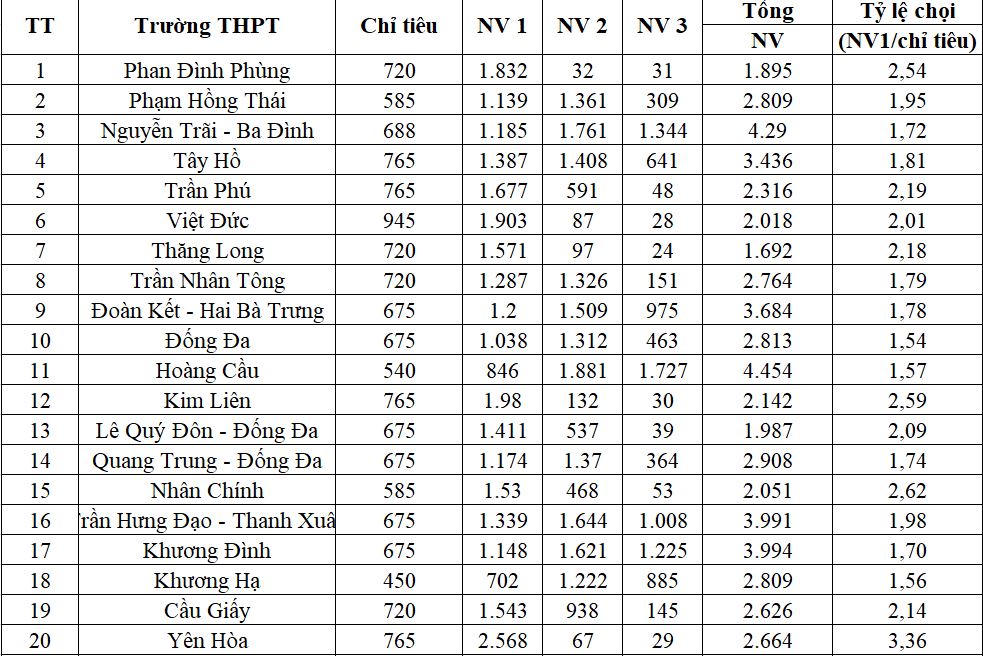 Trong số các trường, THPT Yên Hòa có tỷ lệ chọi cao nhất, 1/3,36, với 765 chỉ tiêu và gần 2.570 nguyện vọng 1. Tiếp theo là THPT Lê Quý Đôn - Hà Đông, tỷ lệ 1/3. Đây đều là những trường có sức hút lớn nhiều năm qua. Tuy nhiên, mức cạnh tranh năm nay tăng mạnh so với các mùa trước, khi tỷ lệ chọi phổ biến khoảng 1/2. Việc công khai số liệu đăng ký theo thời gian thực được cho là khiến thí sinh tập trung vào các trường top, làm gia tăng áp lực cạnh tranh.