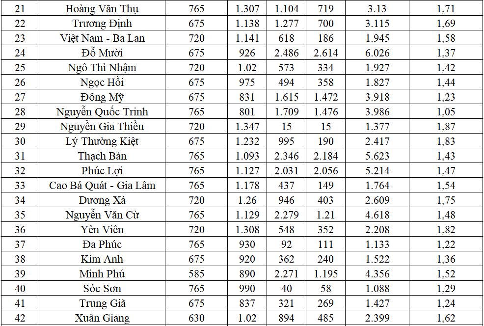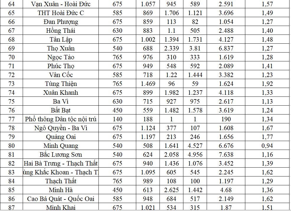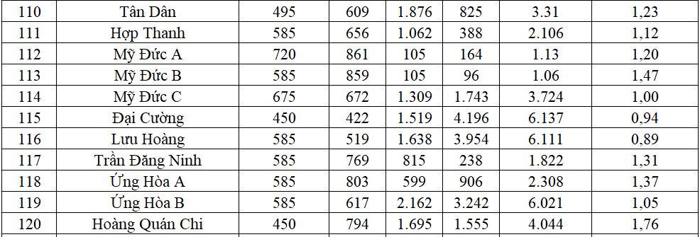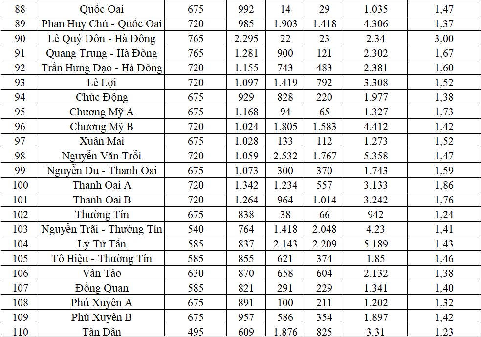 Dưới đây là Thống kê chi tiết số nguyện vọng, tỷ lệ chọi theo dữ liệu trên hệ thống của Sở Giáo dục và Đào tạo (GD&ĐT) Hà Nội (từ 23h30 đến 23h50 ngày 17/4) của 120 trường THPT công lập không chuyên:
