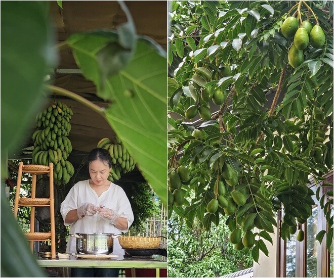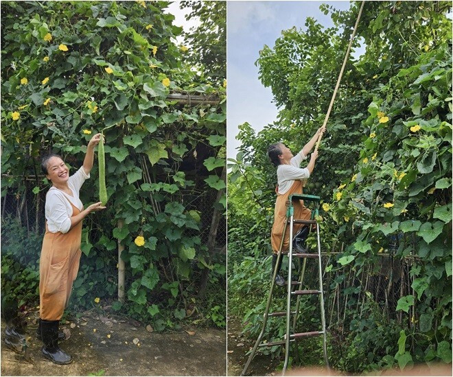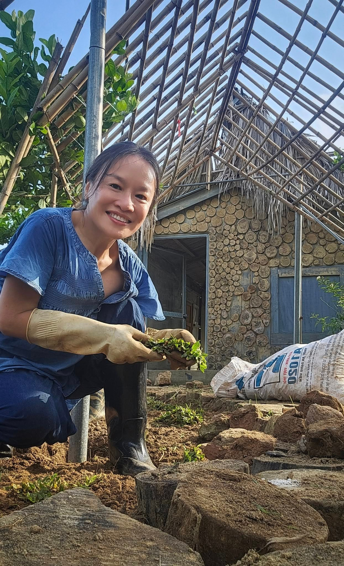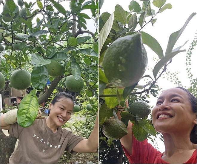 Tại đây, nữ nghệ sĩ tìm niềm vui giản dị với công việc nhổ cỏ, chăm cây, hái trái. Ảnh: FB Oanh Le Tu