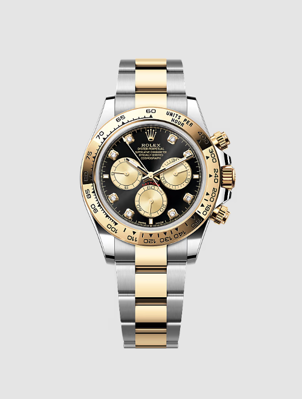 Thiết kế càng thêm phần nổi bật với vành bezel bằng vàng khắc thang đo tachymetric, một chi tiết gắn liền với tinh thần tốc độ và DNA đua xe đặc trưng của dòng Daytona. Mặt số được hoàn thiện tỉ mỉ, bố trí ba mặt số phụ chronograph quen thuộc, tạo nên bố cục cân đối, dễ nhận diện và mang giá trị biểu tượng cao.
