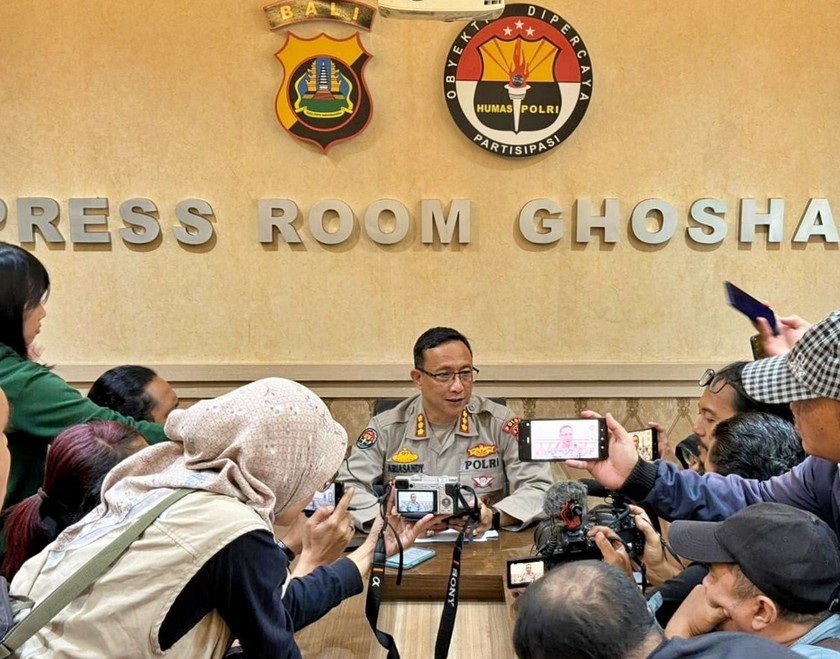 Phát ngôn viên cảnh sát Bali, Thượng tá Ariasandy thông báo với giới báo chí về vụ bắt cóc du khách người Ukraine Igor Komarov tại Bali. Ảnh: thebalitimes
