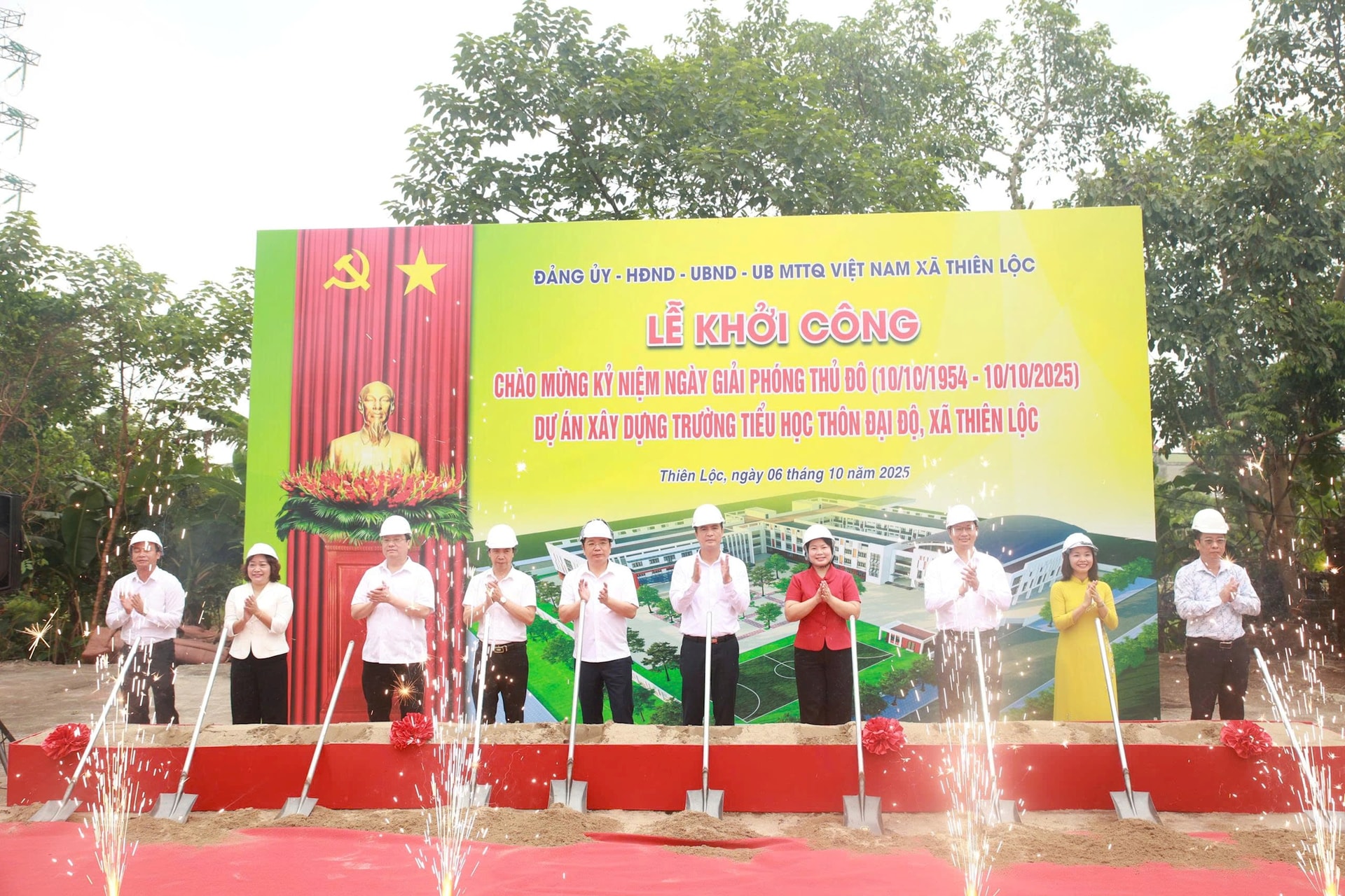 Các đại biểu khởi công Trường Tiểu học thôn Đại Độ. Ảnh: Đỗ Phong