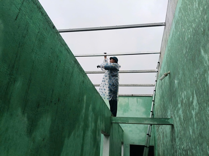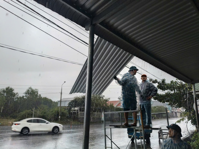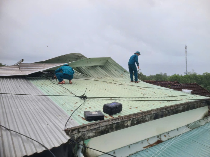 Lực lượng chức năng dầm mưa lợp lại nhà cho người dân