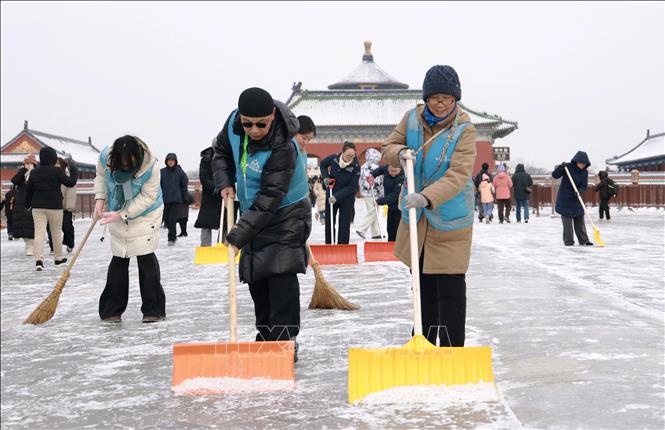 Công nhân được huy động để dọn tuyết tại Bắc Kinh, Trung Quốc ngày 18/1/2026. Ảnh: THX/TTXVN