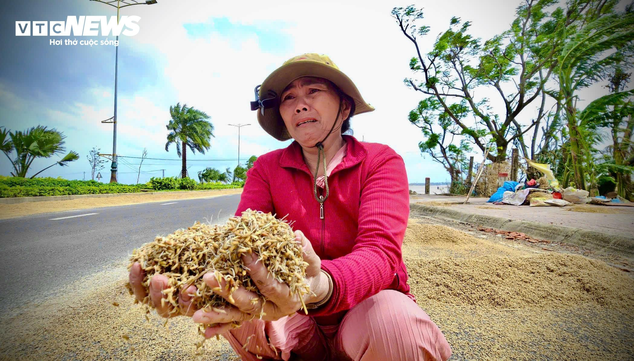 Sau trận lũ, người dân Đắk Lắk phơi những bao thóc đã mọc mầm, chỉ có thể để làm thức ăn cho gia súc, gia cầm. (Ảnh: Nguyễn Gia)