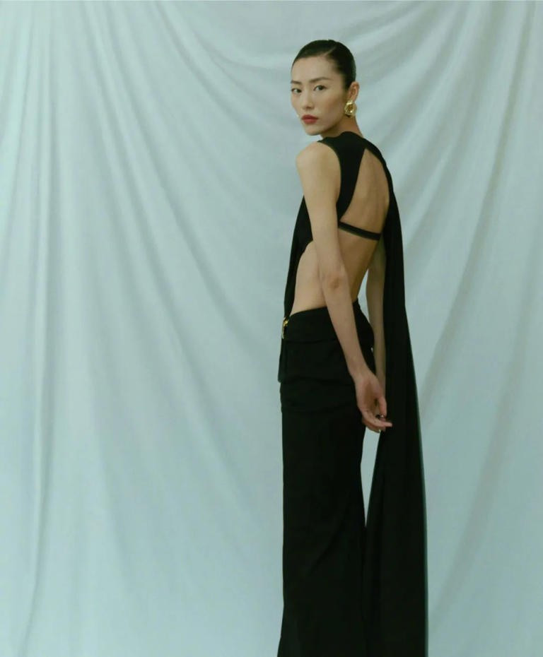 Lưu Văn diện bộ jumpsuit đen, tóc búi cao, toát lên vẻ quyền lực và uy nghiêm. Bộ jumpsuit của cô rất thời thượng với những đường xếp ly bất đối xứng tạo nên vẻ tinh tế cho toàn bộ trang phục. Phần thân dưới ôm sát tôn lên tỷ lệ eo - hông hoàn hảo, đồng thời làm nổi bật đôi chân dài miên man và vòng eo thon thả đến nghẹt thở. Khi xoay người lại, hiệu ứng này càng thêm ấn tượng. Chiếc váy được thiết kế hở lưng, và góc nghiêng cùng đường cong cơ thể của Lưu Văn khoe trọn vóc dáng hoàn hảo cùng xương bả vai thanh tú đặc biệt bắt mắt. Bộ trang phục này chỉ có thể được diện bởi một siêu mẫu sở hữu tỷ lệ hoàn hảo như Lưu Văn, nếu mặc trên người khác, nó có thể sẽ là thảm họa.