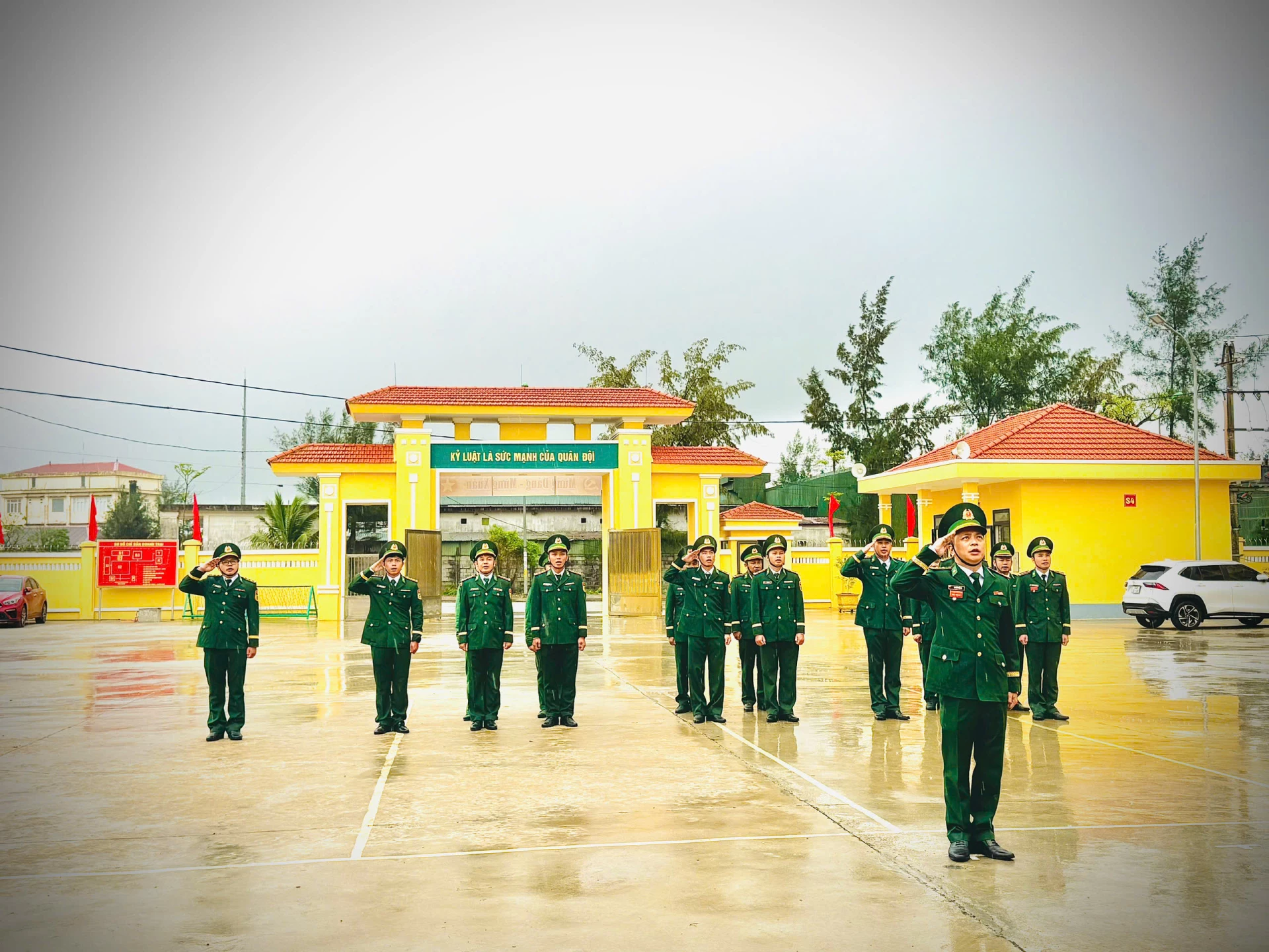 Cán bộ, chiến sĩ Đồn Biên phòng cửa khẩu cảng Cửa Việt nghiêm trang trong nghi thức chào cờ đầu năm mới - Ảnh: Mai Linh