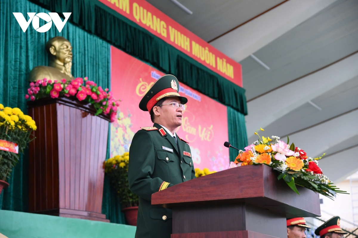 Trong không khí trang nghiêm của những giờ phút đầu năm mới, Thiếu tướng Lương Đình Chung đọc Thư chúc Tết Bính Ngọ 2026 của Thường vụ Đảng ủy - Bộ Tư lệnh Quân khu 5, gửi lời chúc mừng năm mới tới toàn thể cán bộ, chiến sĩ, nhân viên lực lượng vũ trang Quân khu 5.