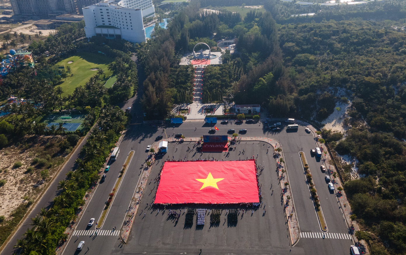 Tại buổi lễ, lá cờ Tổ quốc rộng 2.166 m² được trải trên quảng trường trong phần nghi thức tôn vinh lá cờ.