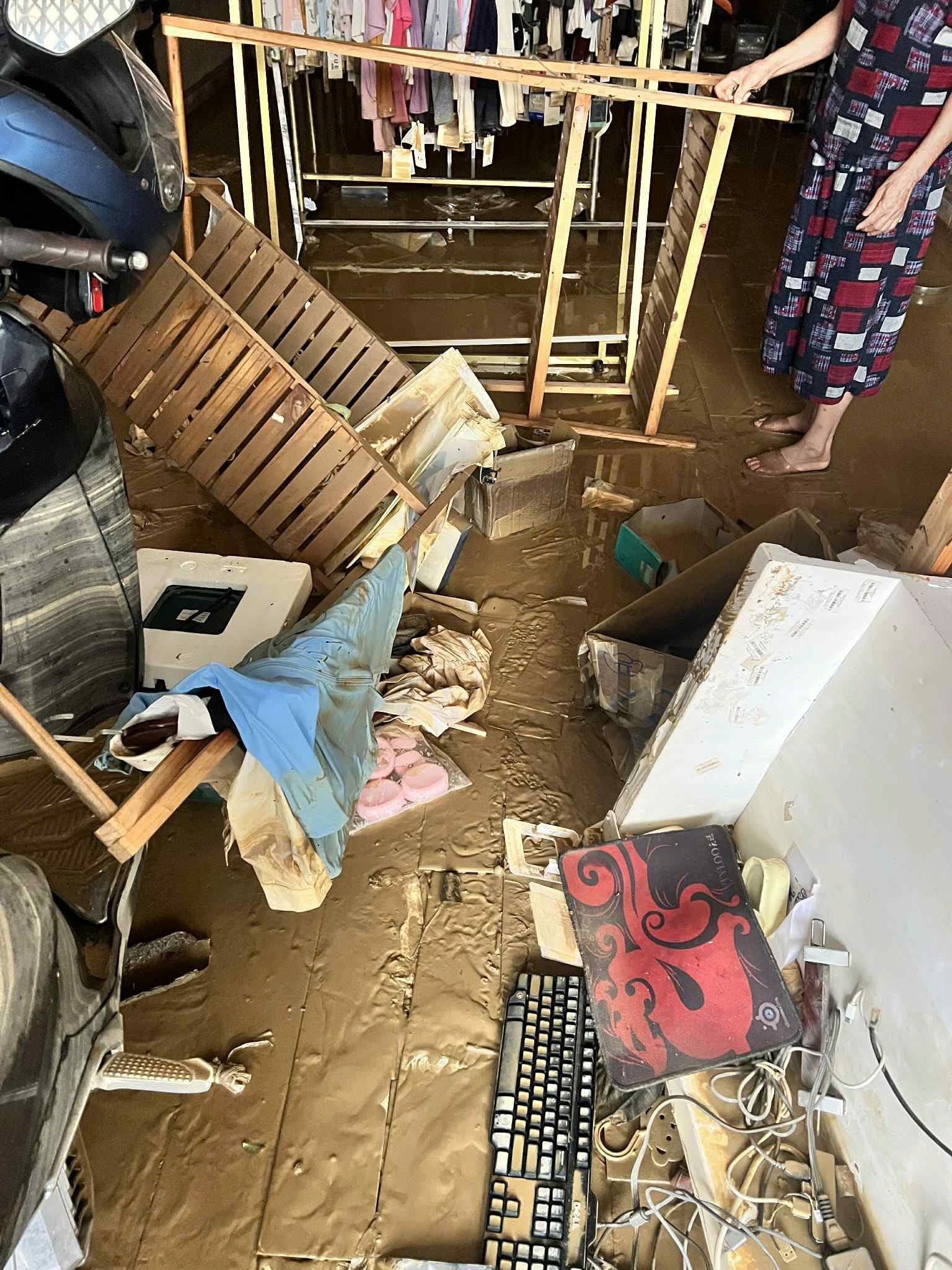 Chị Xuyến ước tính tổng thiệt hại khoảng 400 triệu đồng, trong đó riêng hệ thống tủ lạnh chiếm hơn 200 triệu, phần còn lại là hàng hóa, bao bì, giấy tờ.