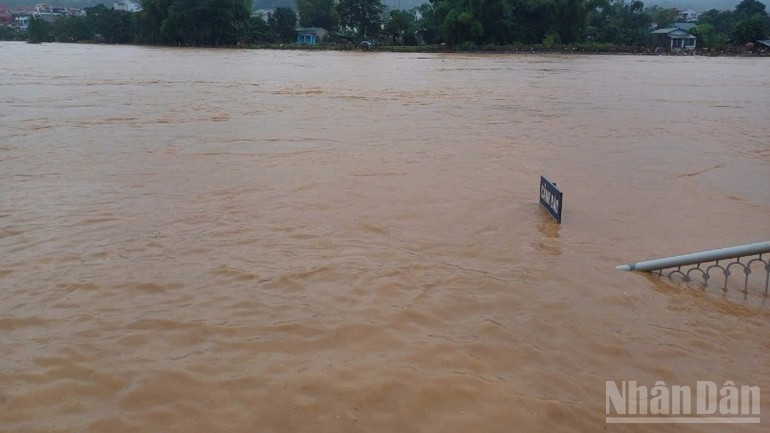 Nước lũ dâng cao trên sông Bằng, đoạn qua phường Thục Phán, tỉnh Cao Bằng. (Ảnh: MINH TUẤN)