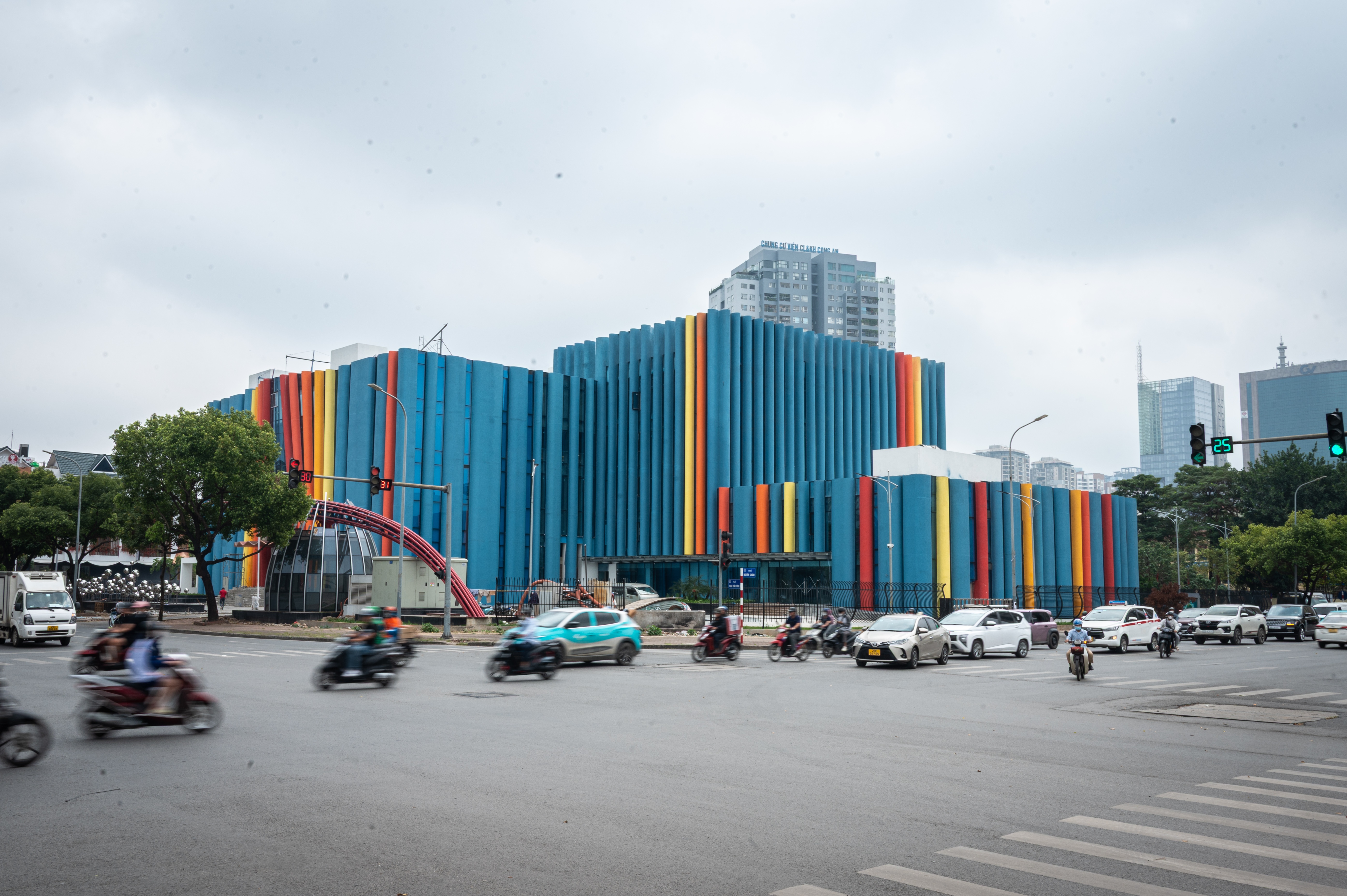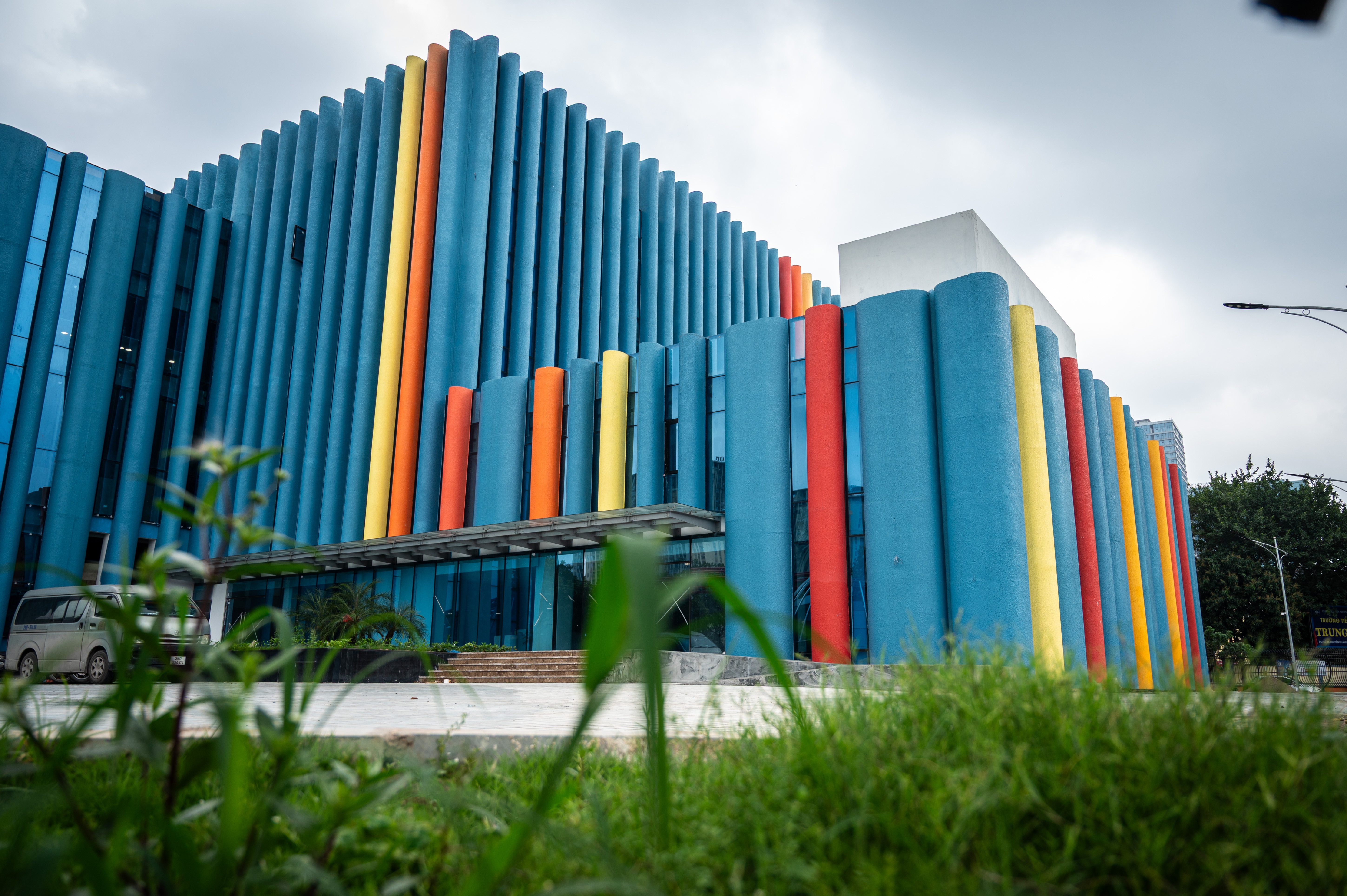 Công trình nổi bật với tông màu xanh chủ đạo, được tạo hình từ các dãy cột đứng liên tiếp, xen kẽ các mảng màu đỏ, vàng, cam chạy dọc thân nhà.