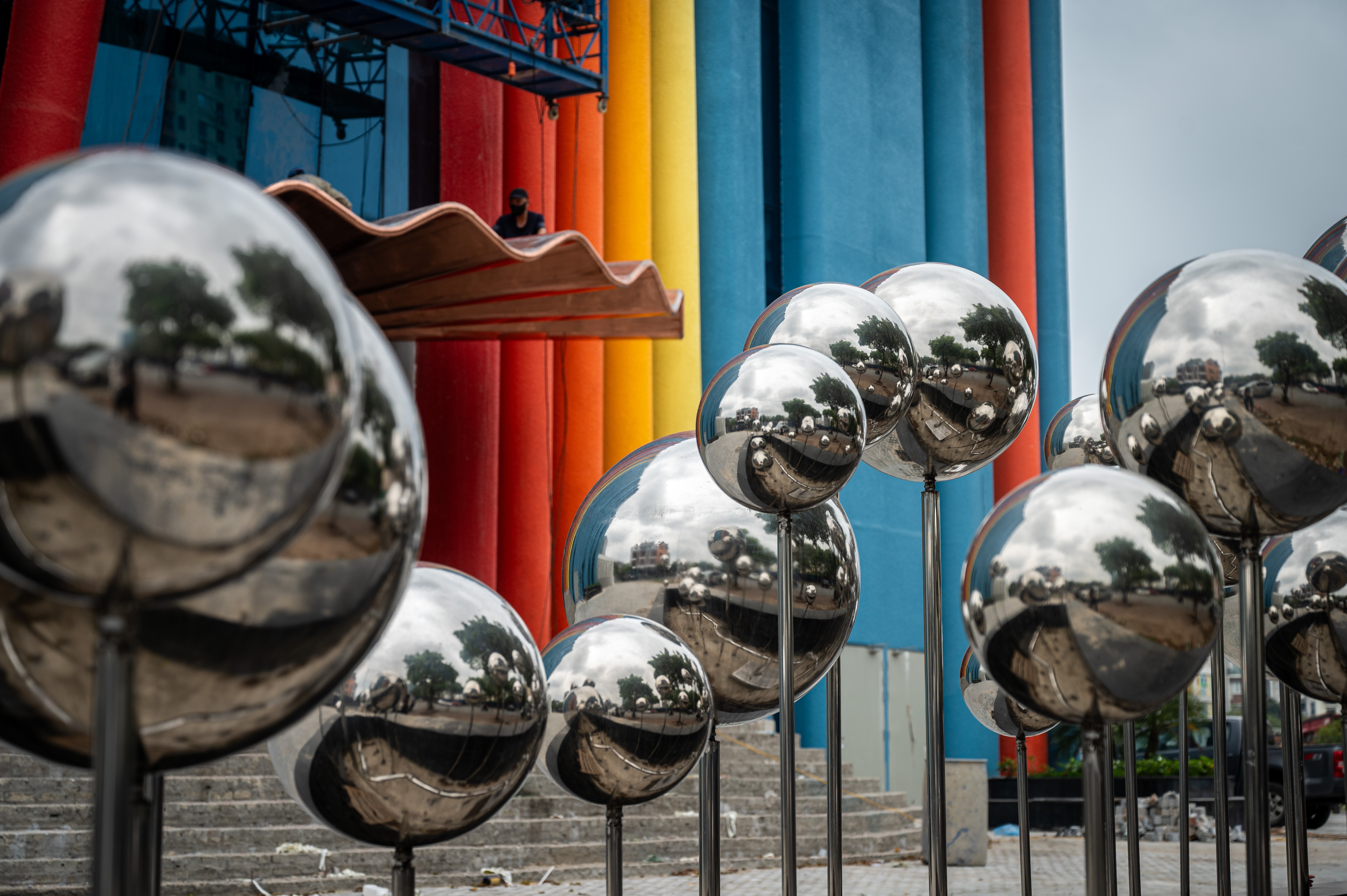 Khu vực đài phun nước được thiết kế với hàng chục quả cầu pha lê trong suốt làm điểm nhấn kiến trúc bên ngoài mặt tiền nhà hát.