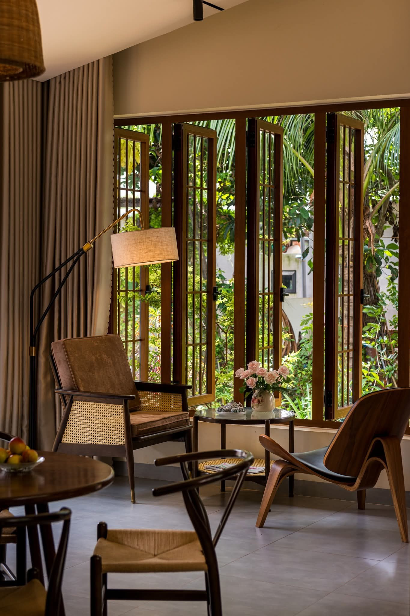 Hồ nước trước hiên trở thành điểm nhấn nhẹ nhàng, nơi bước chân ai cũng chậm lại, để rồi khẽ chạm vào những vệt nắng và làn gió mát len qua bức tường bông gió đầy hoài niệm.