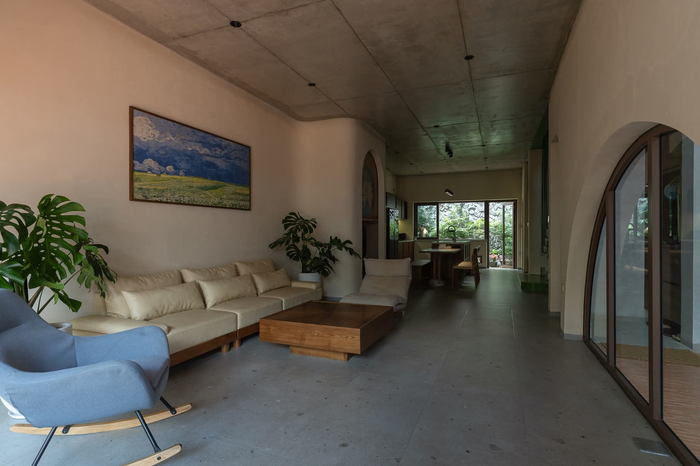 Với độ sâu sẵn có của khu đất, các không gian sinh hoạt chung được tổ chức lần lượt từ ngoài vào trong là phòng khách, phòng thờ, bàn ăn và bếp, cuối cùng là sân sau trồng nhiều loại cây xanh.