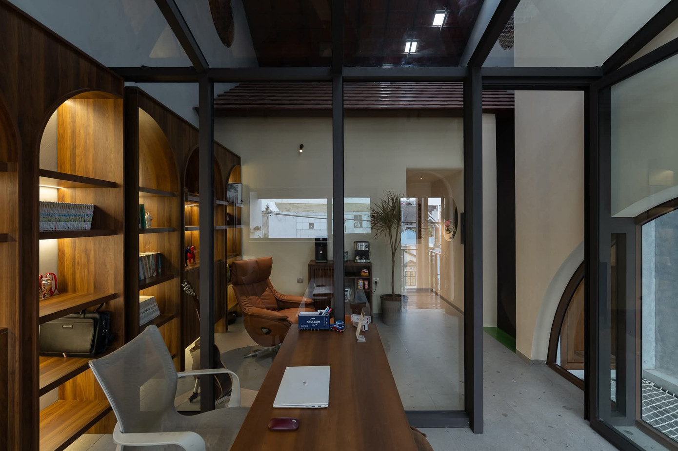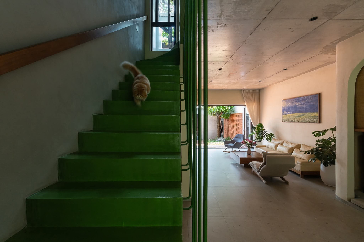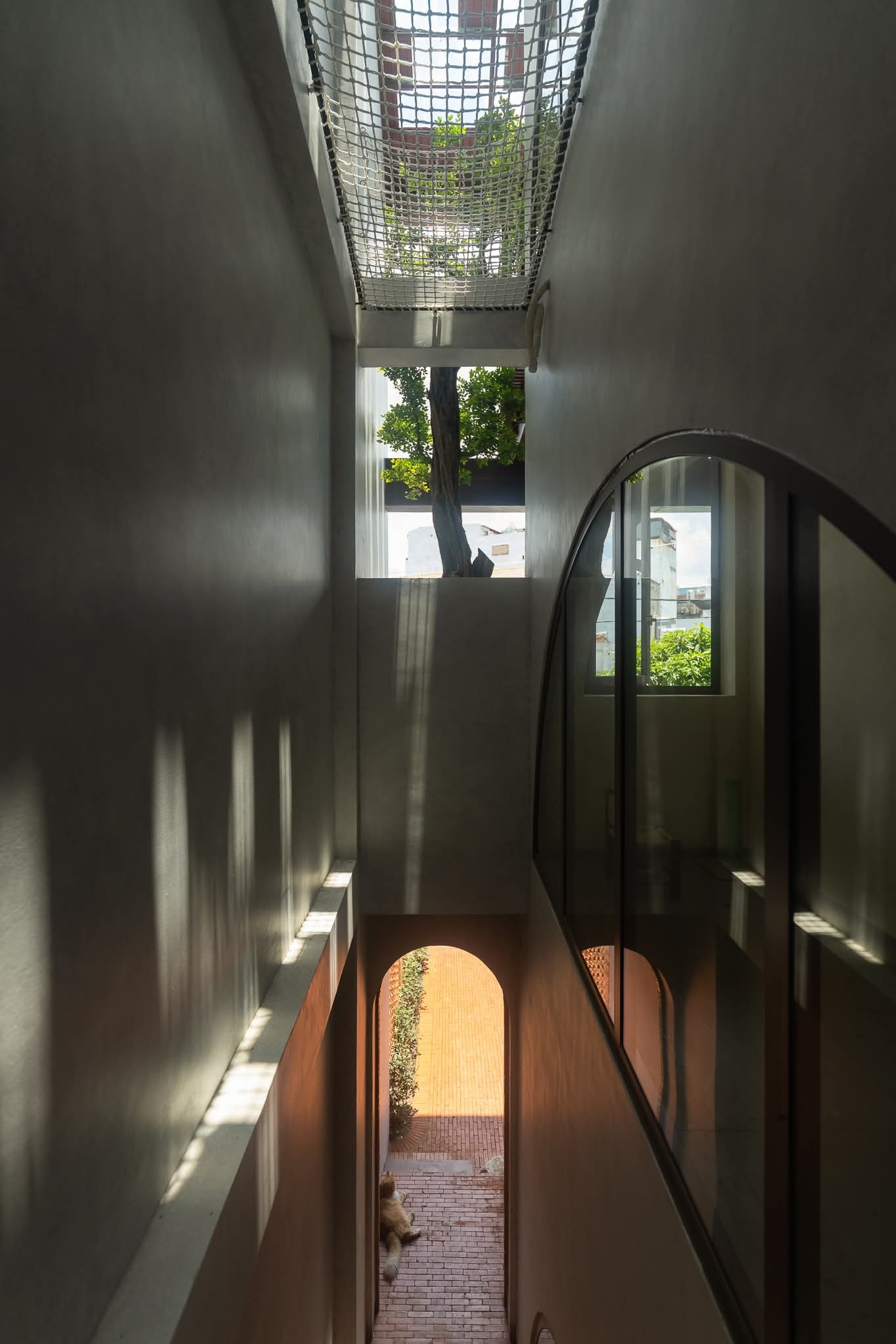 Từ thang chéo được bố trí sát tường dẫn lên các tầng là những phòng ngủ, phòng làm việc. Các giếng trời và ô thoáng được phân chia khéo léo để lấy ánh sáng và đối lưu không khí theo trục đứng căn nhà.